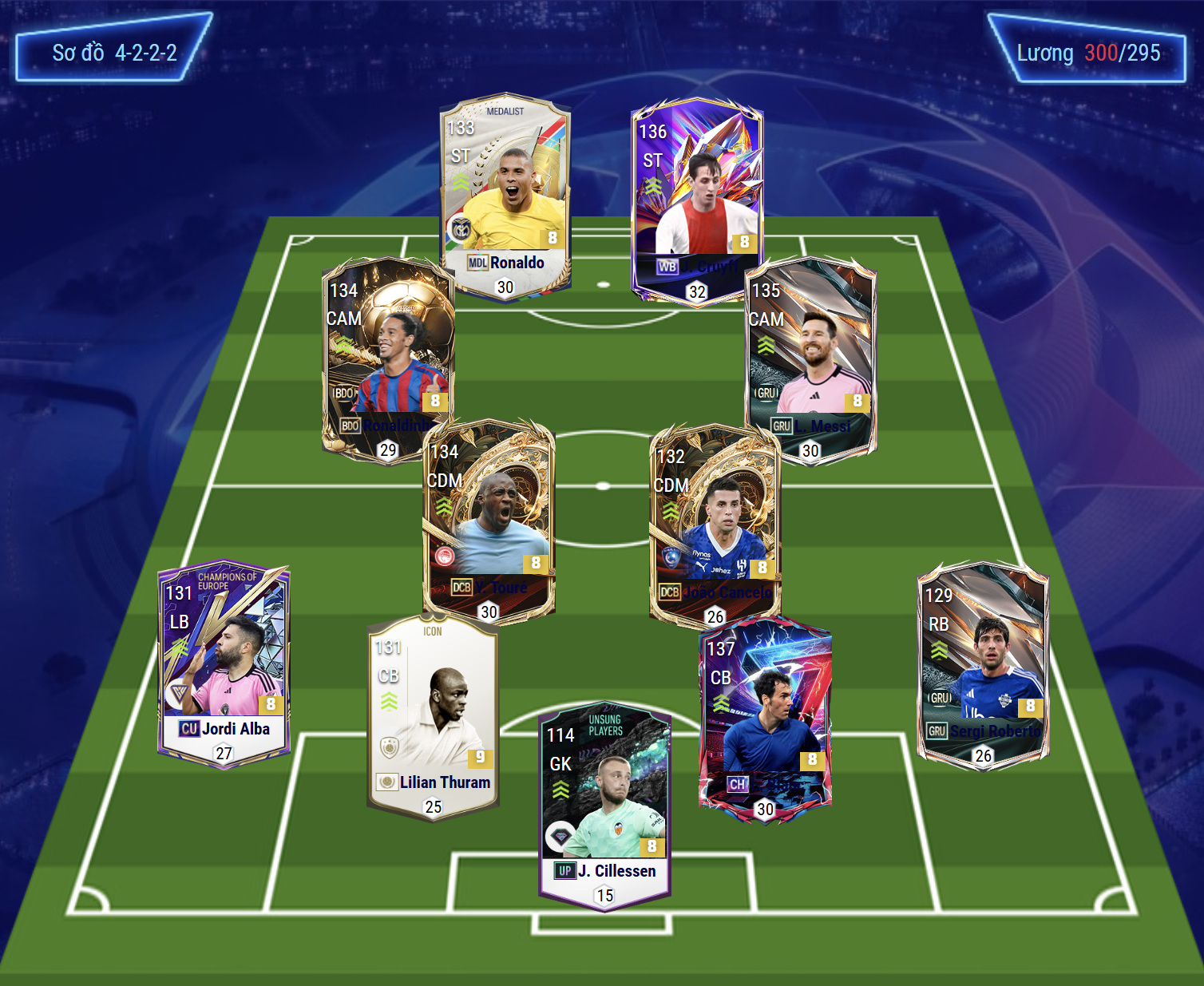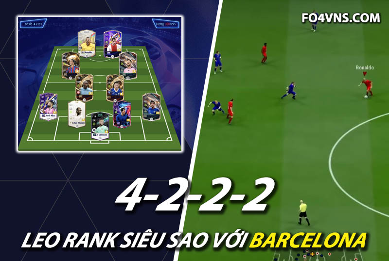 Sơ đồ 4222 được lựa chọn với vị trí tiền đạo cắm là Ronaldo và Cruyff, cả 2 sở hữu tốc độ, khả năng dứt điểm nổi bật bằng cả 2 chân cả trong lẫn ngoài vòng cấm. Bộ đôi tấn công này có điểm mạnh là khả năng ZD cực kì xuất sắc cùng với đó kỹ năng phối hợp tốt giúp đa dạng lối chơi tấn công.