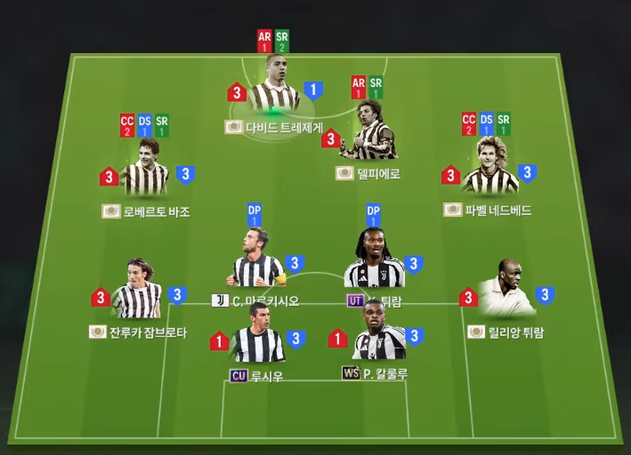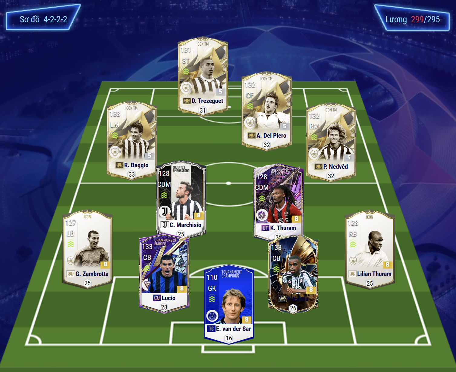 Sơ đồ 4222 được lựa chọn với vị trí tiền đạo cắm là Trezeguet với khả năng không chiến và dứt điểm nổi bật. Hỗ trợ phía sau là Del Piero cho vai trò tiền đạo hộ công sẽ đá hơi lùi 1 chút làm bóng cho Trezeguet cùng với đó là ghi bàn tuyến 2 khi cần. Cặp tiền vệ cánh Baggio và Nedved sở hữu tốc độ tốt, khả năng chuyền tạt lẫn sút xa hay ở cả 2 chân giúp những tình huống dâng cao tấn công cực kì ổn.