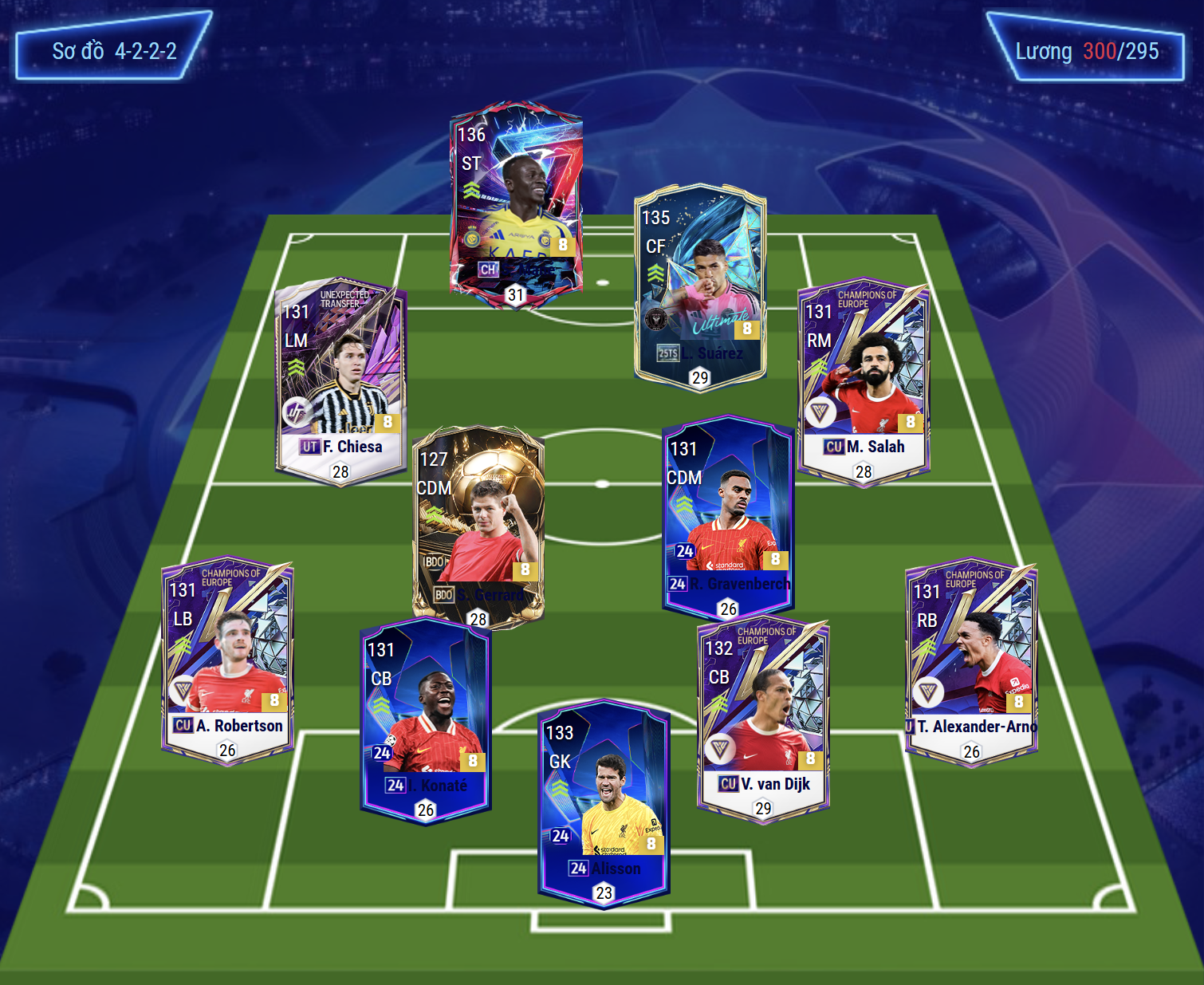 Sơ đồ được lựa chọn cho team color Liverpool lần này là sơ đồ 4222 ST/CF. Với vị trí tiền đạo của sơ đồ này là Sadio Mane, cầu thủ người Senegal là mẫu tiền đạo có tốc độ tốt, AI di chuyển khôn cùng khả năng ra chân nhanh và chính xác sẽ giúp tối ưu hiệu quả ghi bàn. Hỗ trợ phía sau là Suarez cho vị trí hộ công, mẫu tiền đạo vừa có khả năng săn bàn vừa có kỹ năng kiến tạo giúp việc hỗ trợ phối hợp tốt và tạo nên nhiều đột biến trong tấn công.