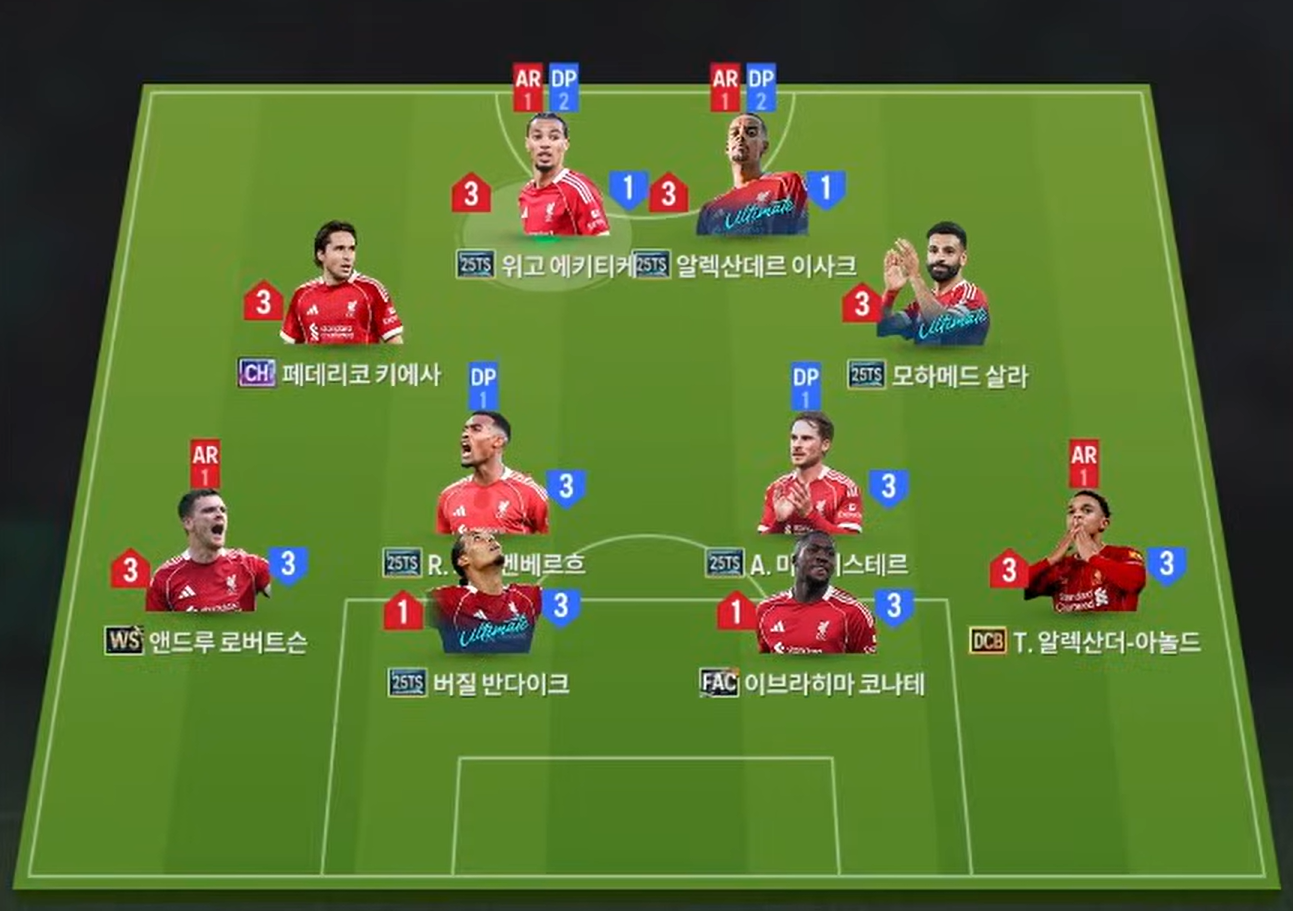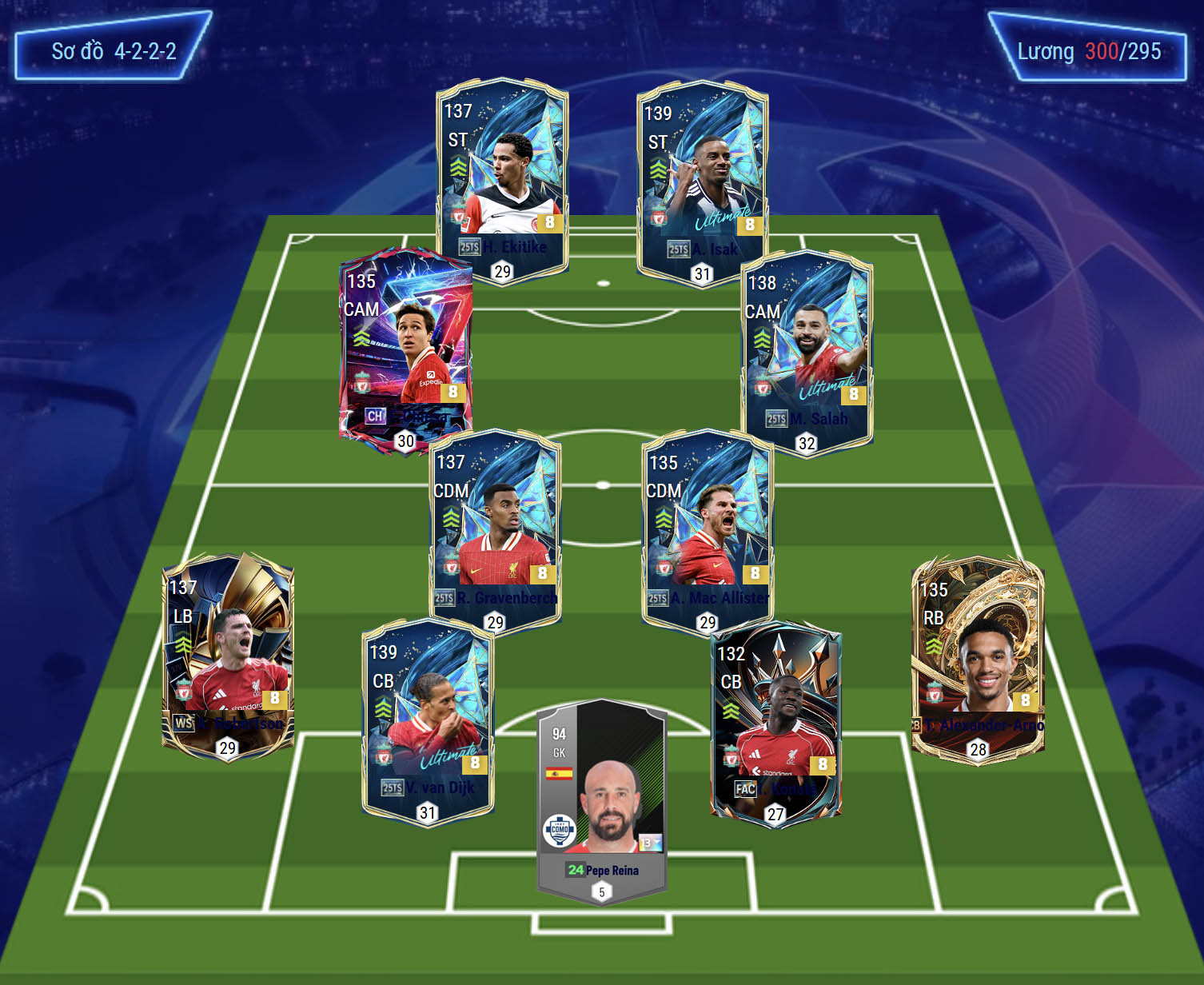 Sơ đồ 4222 được lựa chọn cho team color Liverpool đương đại với vị trí tiền đạo cắm là cặp đôi Ekitike và Isak, cả 2 đều là những cái tên có tốc độ tốt, khả năng dứt điểm nổi bật, rê dắt xoay sở cho tới chuyền bóng phối hợp đều cực kì ổn định. Hỗ trợ phía sau là cặp đôi tiền vệ tấn công LAM và RAM với 2 cái tên Chiesa và Salah, cả 2 vừa thi đấu bám biên vừa tham gia hỗ trợ tấn công cho tới chuyền tạt hiệu quả.