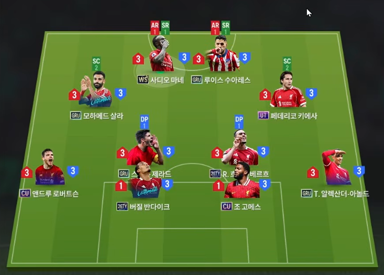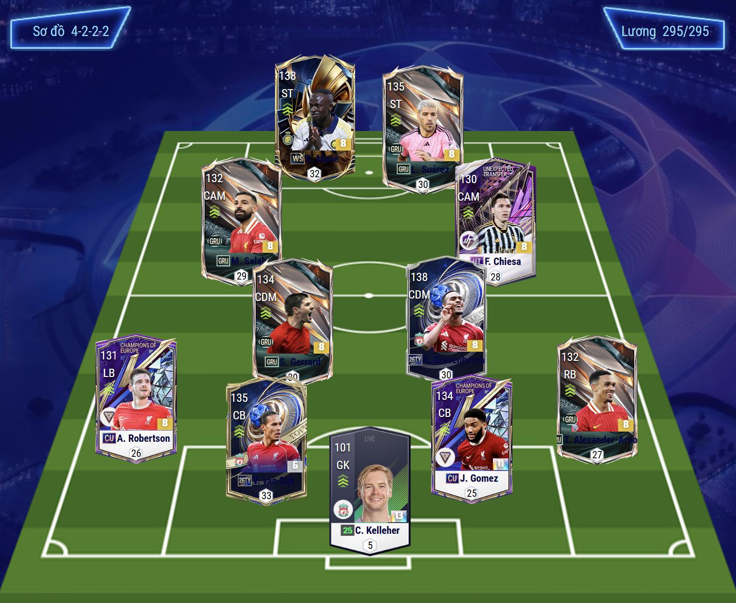 Sơ đồ 4222 được lựa chọn với vị trí tiền đạo cắm là cặp đôi Mane và Suarez, cả 2 đều là những cái tên sở hữu tốc độ tốt, khả năng dứt điểm nổi bật bằng cả 2 chân, di chuyển không bóng kéo người lẫn chọn vị trí nhận bóng cũng cực kì hiệu quả. Hỗ trợ phía sau là cặp đôi LAM, RAM lần lượt là Salah và Chiesa, 2 cái tên này vừa bám cánh hiệu quả, vừa tham gia tốt trong các tình huống xâm nhập tấn công.