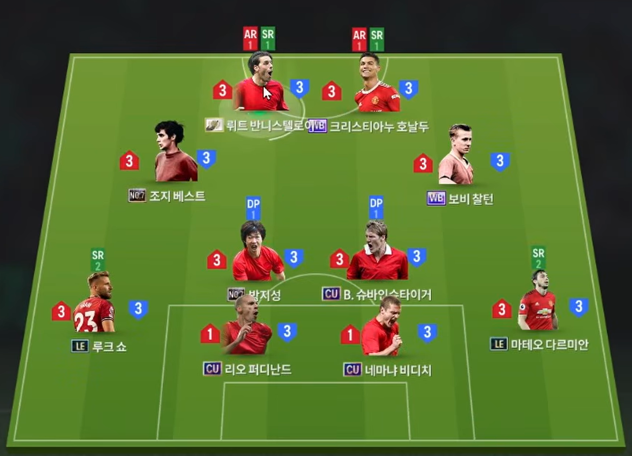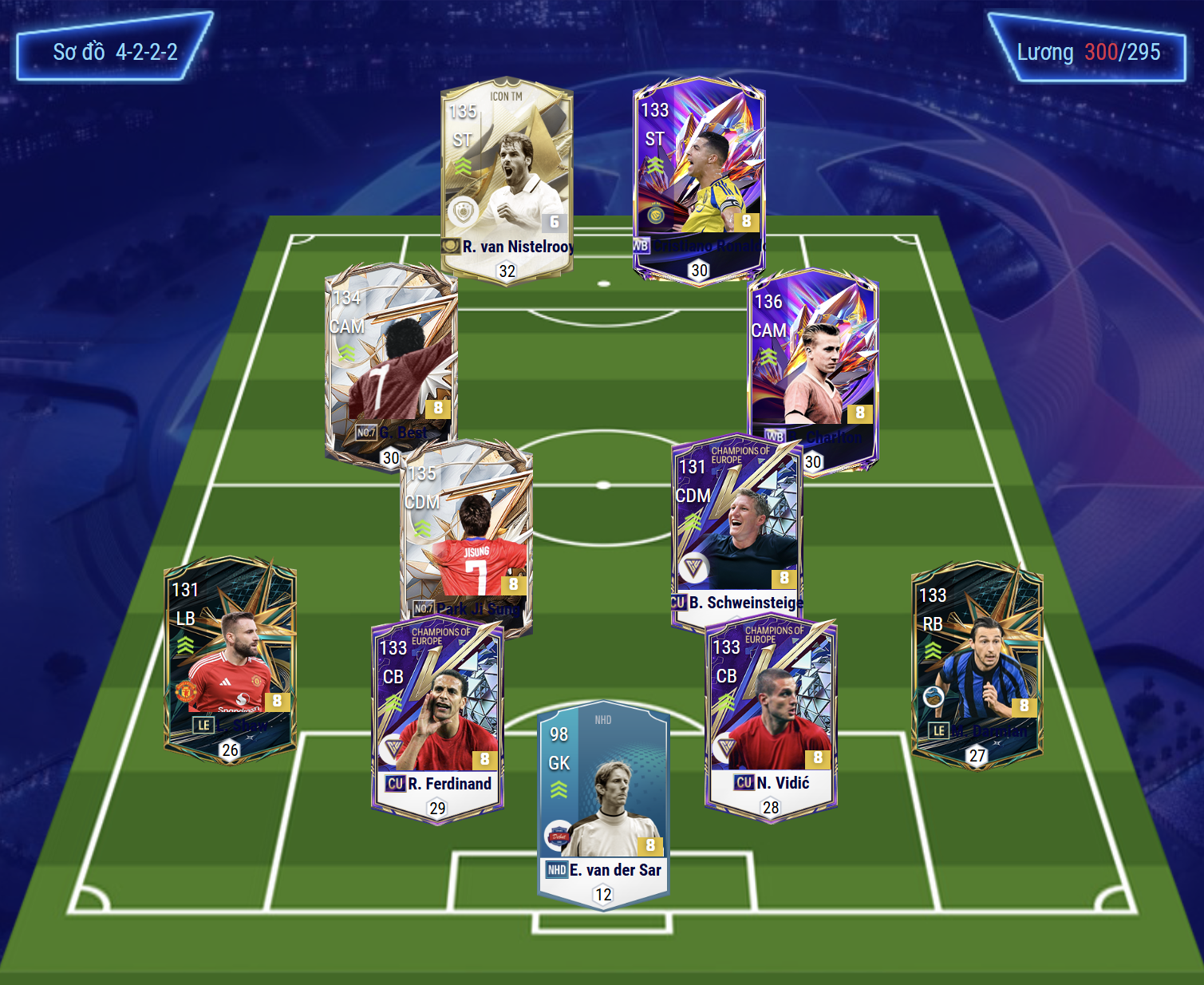 Sơ đồ 4222 được lựa chọn với vị trí tiền đạo cắm là Van Nistelrooy và Cristiano Ronaldo, cả 2 đều là những chân sút cực kì uy tín trong vòng cấm với độ chính xác trong các pha ra chân có lực căng và rất hiểm. Khả năng không chiến tốt cũng là điểm mạnh để đa dạng lối chơi tấn công của toàn đội.