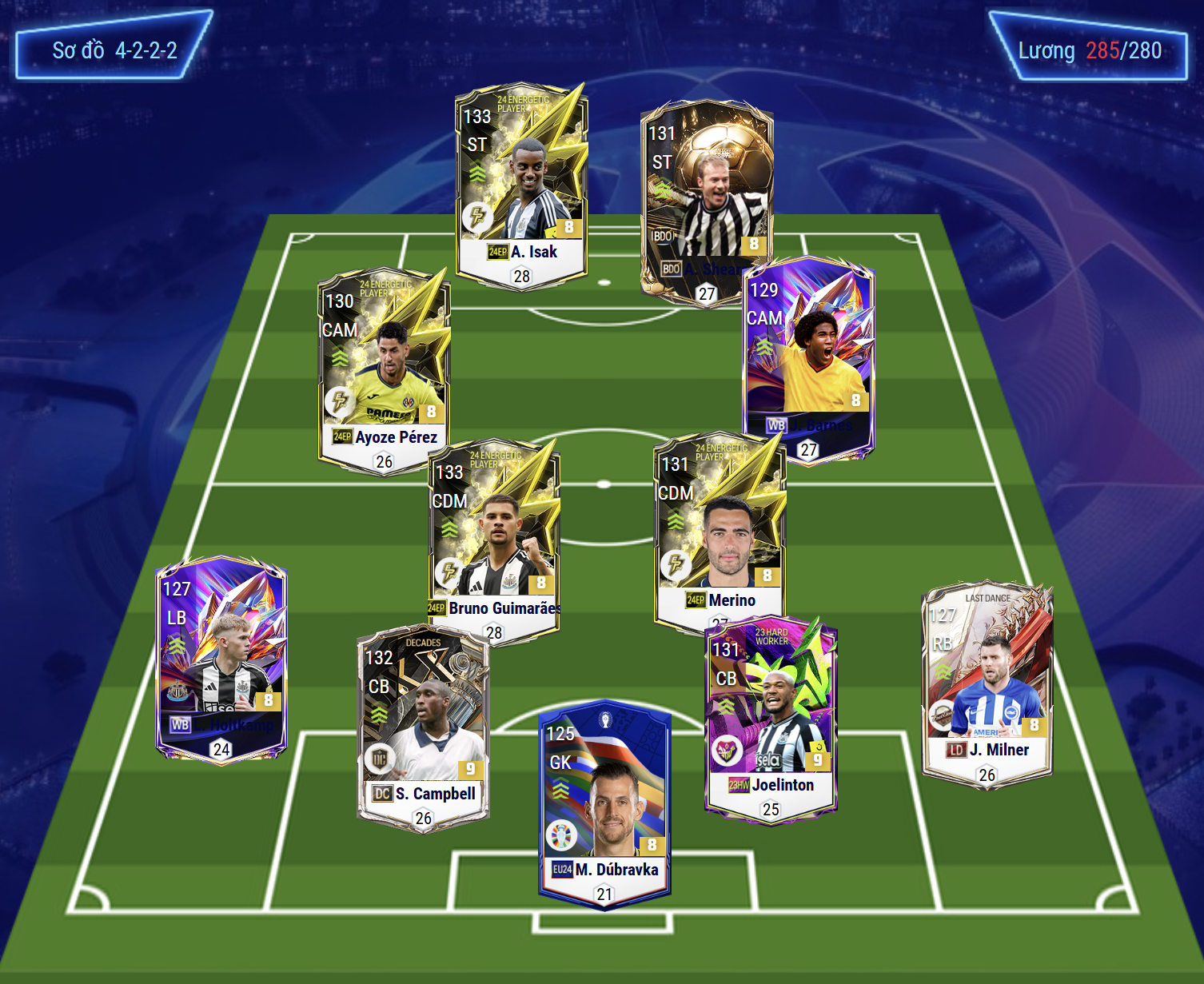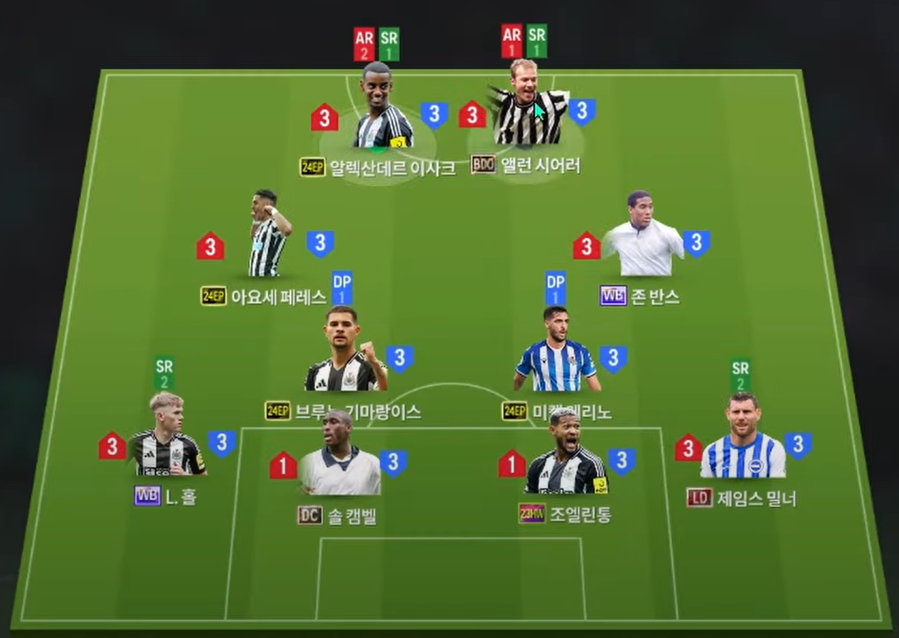 Sơ đồ 4222 được lựa chọn với vị trí tiền đạo cắm là Isak và Shearer, cả 2 đều là những chân săn bàn chất lượng với AI di chuyển thông minh, khả năng dứt điểm sắc bén cùng kỹ năng đánh đầu hiệu quả. Cặp tiền vệ tấn công lệch cánh lần lượt là Perez và Barnes sở hữu tốc độ, khả năng chuyền tạt lẫn xâm nhập vòng cấm khá hiệu quả.