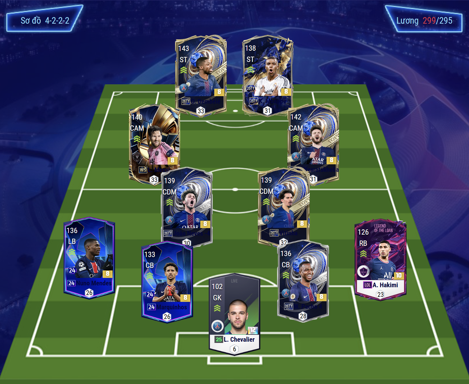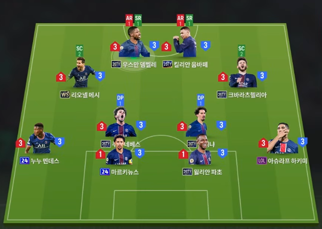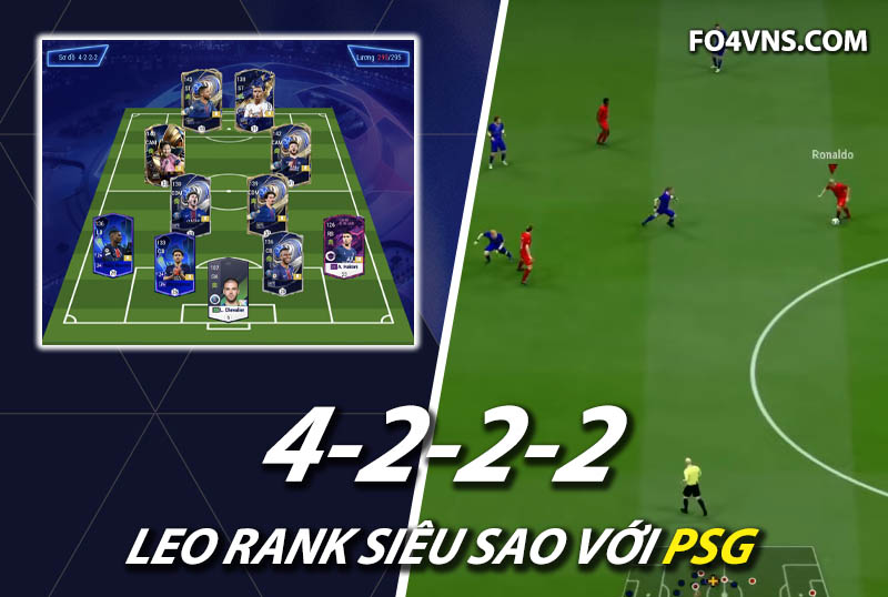Sơ đồ 4222 được lựa chọn cho team color PSG với cặp đôi tiền đạo cắm Dembele và Mbappe sở hữu tốc độ vượt trội cùng khả năng dứt điểm toàn diện bằng cả 2 chân, AI di chuyển không bóng khôn cùng kỹ năng rê dắt tốt giúp bộ đôi này cực kì khó chịu ở meta hiện tại.