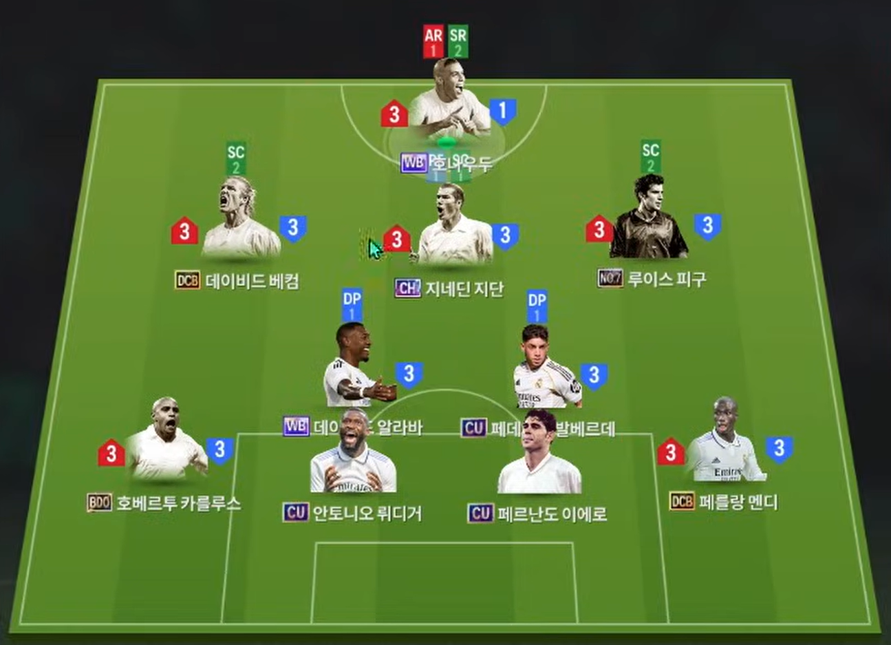 Sơ đồ 4231 được lựa chọn cho team color Real Madrid với vị trí tiền đạo cắm là Ronaldo de lima, tiền đạo người Brazil sở hữu tốc độ, khả năng rê dắt tốt cùng kỹ năng dứt điểm cực kì đa dạng. Hỗ trợ phía sau là bộ 3 tiền vệ công Beckham, Zidane và Figo lần lượt cho 3 vị trí LAM, CAM và RAM. Trong đó Beckham và Figo sẽ có xu hướng bám biên nhiều hơn và tham gia nhiều vào các tình huống tấn công cánh trong khi Zidane sẽ có xu hướng thi đấu như 1 hộ công hỗ trợ trực tiếp cho Ronaldo.