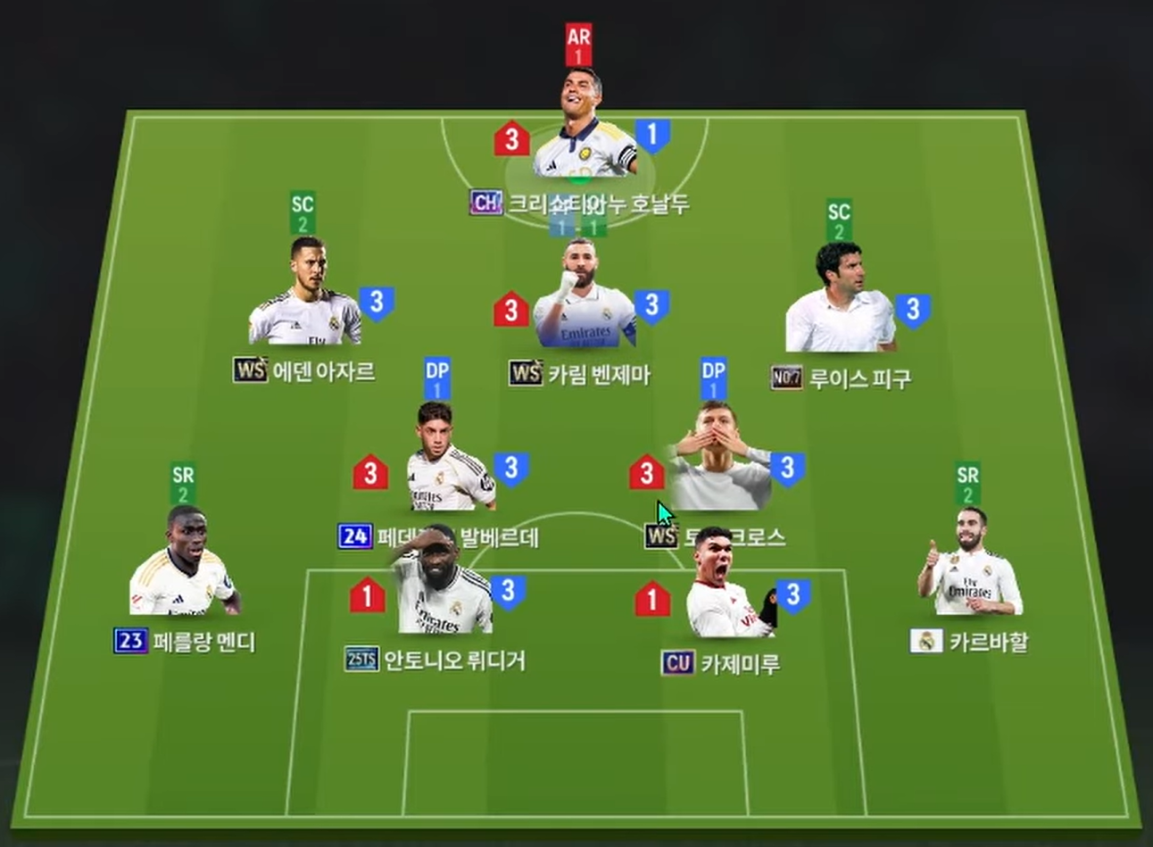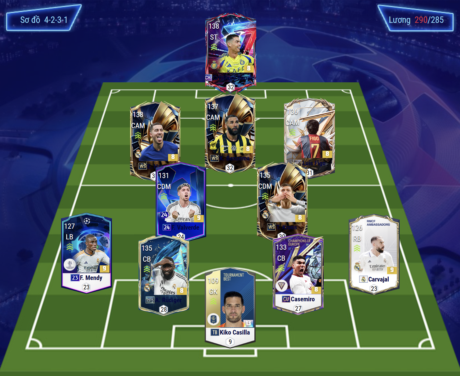 Sơ đồ 4231 được lựa chọn cho team color Real Madrid với vị trí tiền đạo cắm là Cristiano Ronaldo, cầu thủ người Bồ được đánh giá là toàn diện hàng đầu FC Online cho vị trí tiền đạo cắm từ tốc độ, kỹ năng dứt điểm, AI di chuyển cho tới không chiến hiệu quả. Phía sau là bộ 3 tiền vệ tấn công Hazard, Benzema và Figo lần lượt cho 3 vị trí LAM, CAM và RAM. Trong đó Hazard và Figo sẽ có xu hướng bám biên nhiều hơn trong khi Benzema lại thi đấu như 1 hộ công đích thực, kết hợp trực tiếp với CR7.