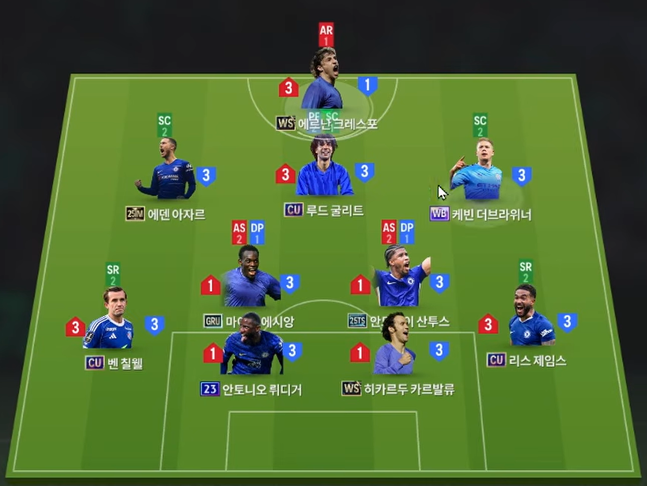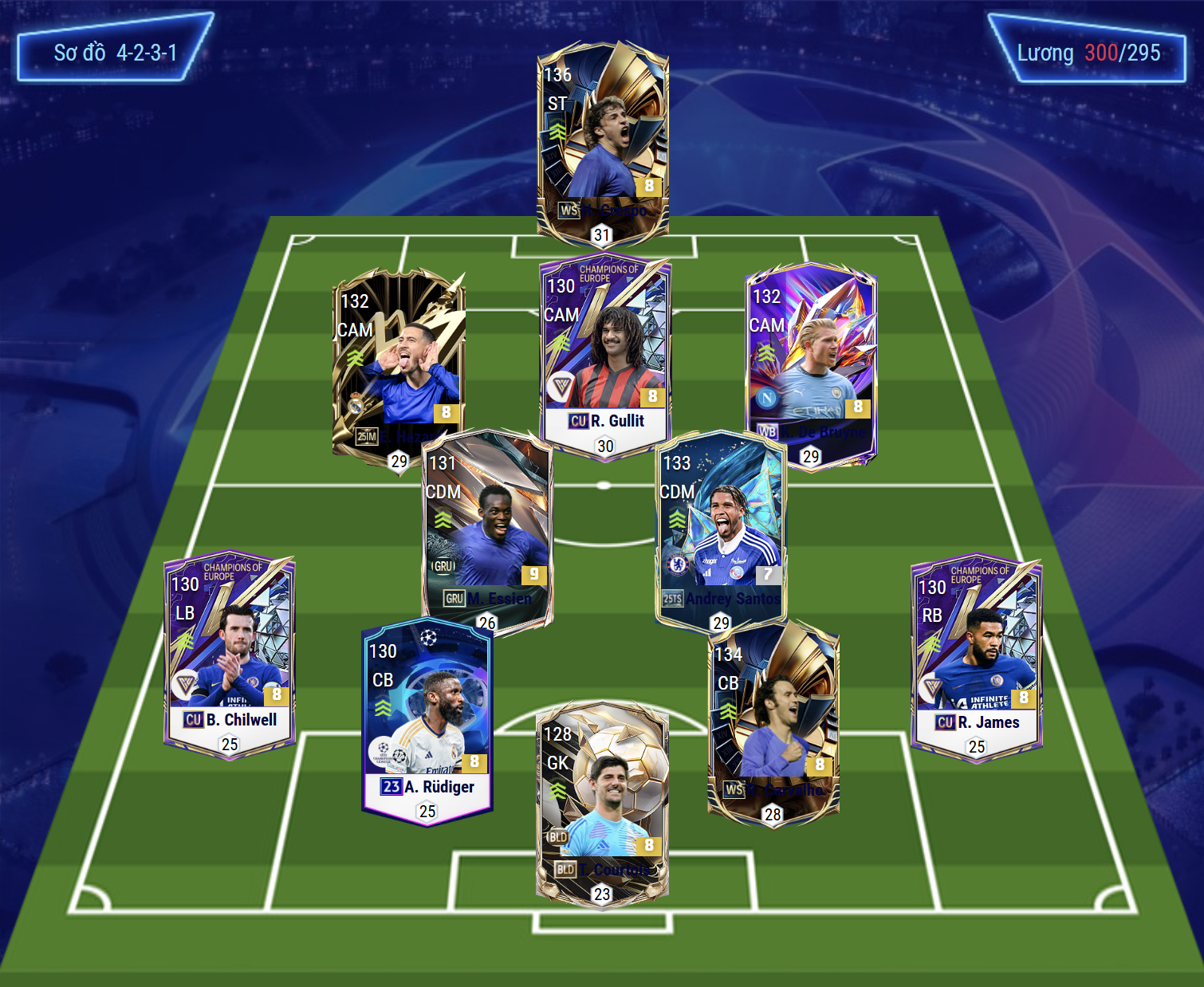 Sơ đồ 4231 được lựa chọn với vị trí tiền đạo cắm là Crespo, cầu thủ người Argentina sở hữu khả năng ghi bàn nổi trội, AI di chuyển thông minh cùng bộ kỹ năng không chiến nổi bật khiến tỉ lệ thành bàn tăng lên đáng kể. Bộ 3 tiền vệ tấn công Hazard, Gullit và Bruyne lần lượt cho 3 vị trí LAM, CAM và RAM. Trong đó Gullit sẽ có xu hướng thi đấu bám trung lộ hỗ trợ trực tiếp cho tiền đạo trong khi Hazard và De Bruyne sẽ có xu hướng bám biên nhiều hơn.