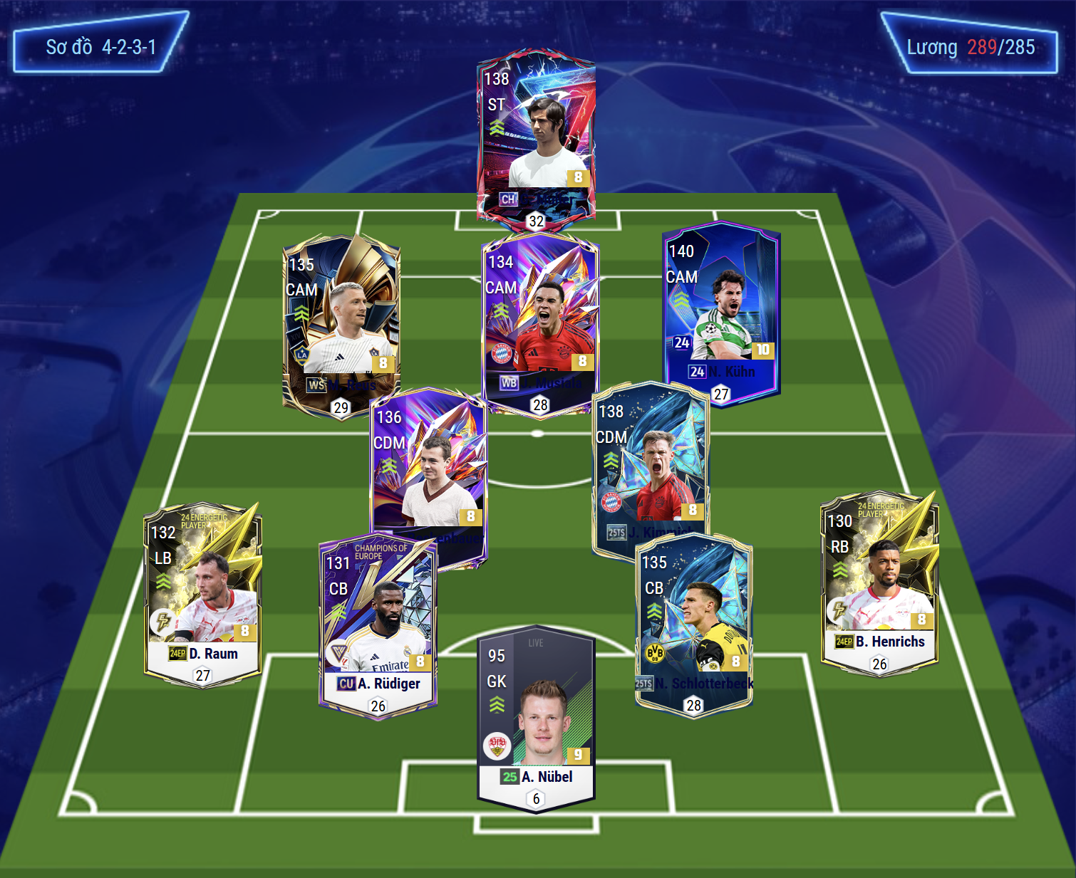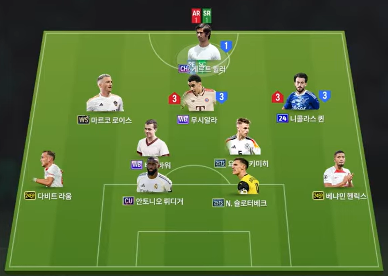 Sơ đồ 4231 được lựa chọn với vị trí tiền đạo cắm là Gerd Muller, vua dội bom của bóng đá Đức với khả năng dứt điểm toàn diện bằng cả 2 chân trong phạm vi vòng cấm, tốc độ ổn cùng khả năng tì đè khó chịu cũng là những điểm lợi thế của tiền đạo người Đức. Bộ 3 tiền vệ công Reus, Musiala và Kuhn lần lượt cho 3 vị trí LAM, CAM và RAM. Cả 3 đều sở hữu khả năng rê dắt, chuyền chọt cho đến dứt điểm tuyến 2 khá hiệu quả đem lại khả năng kiểm soát không gian phía trên một cách hợp lý.