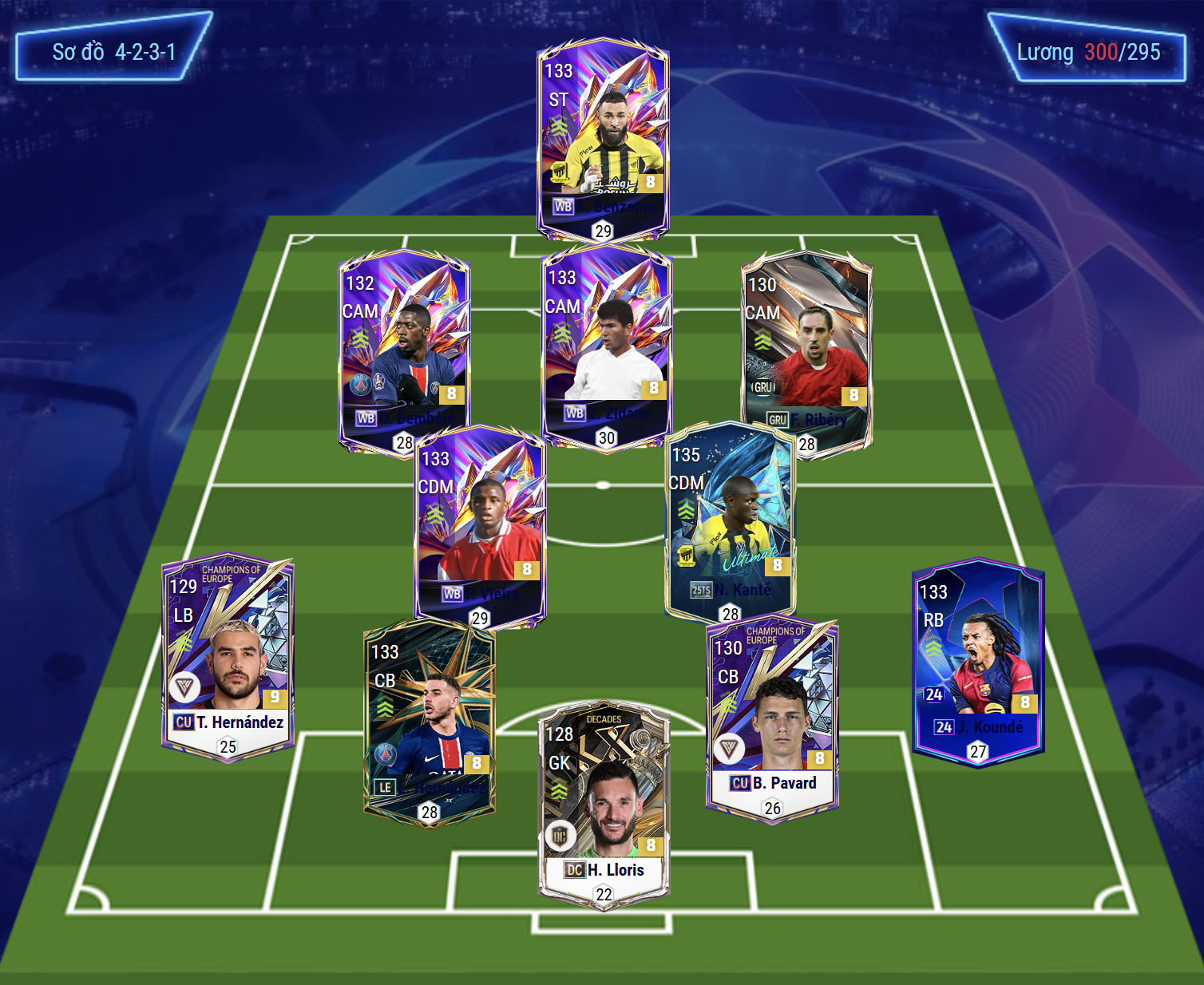Sơ đồ 4231 được lựa chọn với vị trí tiền đạo cắm là Benzema, tiền đạo người Pháp khá toàn diện ở khả năng ghi bàn, kiến tạo cho tới hỗ trợ tấn công. Trong khi đó hỗ trợ phía sau là tiền vệ tấn công LAM, CAM và RAM lần lượt là Dembele, Zidane và Ribery trong đó Dembele và Ribery có xu hướng dạt biên nhiều hơn còn Zidane thì thiên về hộ công hỗ trợ trực tiếp cho tiền đạo cắm.