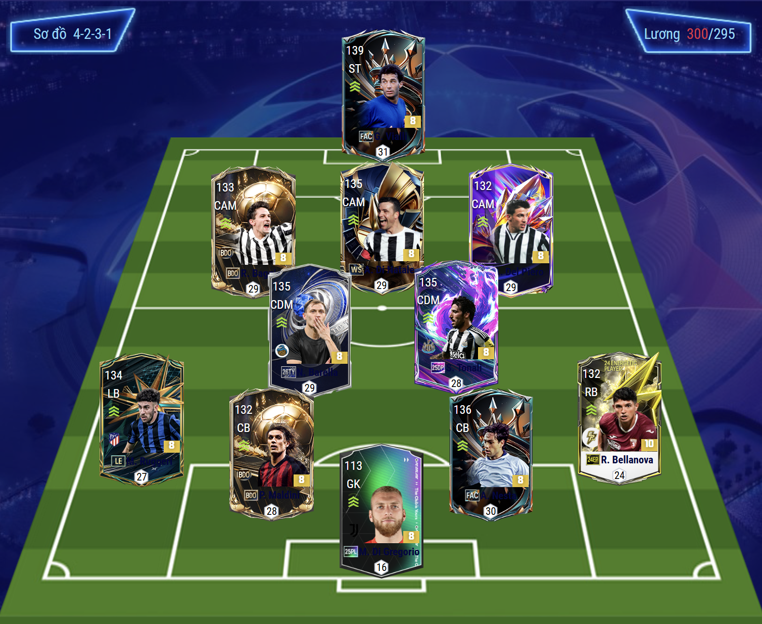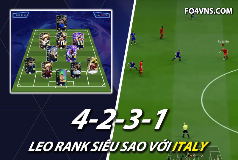 Sơ đồ 4231 được lựa chọn cho team color Italy bao gồm vị trí tiền đạo cắm là Vialli, anh được đánh giá là cây săn bàn đáng dùng nhất cho đội tuyển Ý tại FC Online hiện tại từ dứt điểm bằng cả 2 chân, tốc độ tốt, AI di chuyển hiệu quả, khả năng không chiến cực kì nổi bật. Hỗ trợ phía sau LAM, CAM và RAM lần lượt là Baggio, Di Natale và Del Piero. Cả 3 sở hữu tốc độ tốt, khả năng thi đấu toàn diện từ rê bóng, chuyền bóng cho tới sút bóng cực kì ấn tượng.