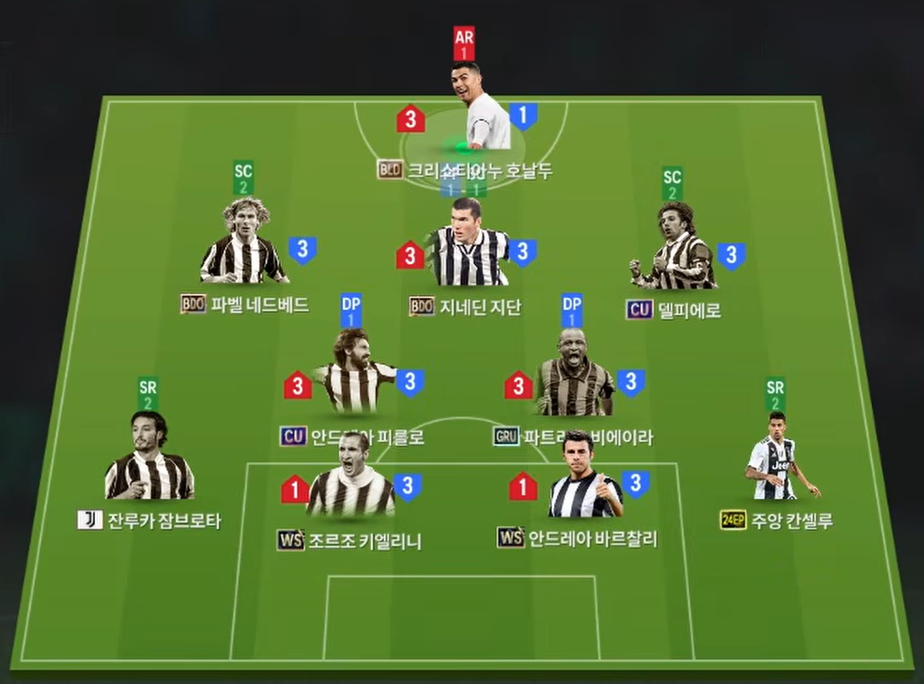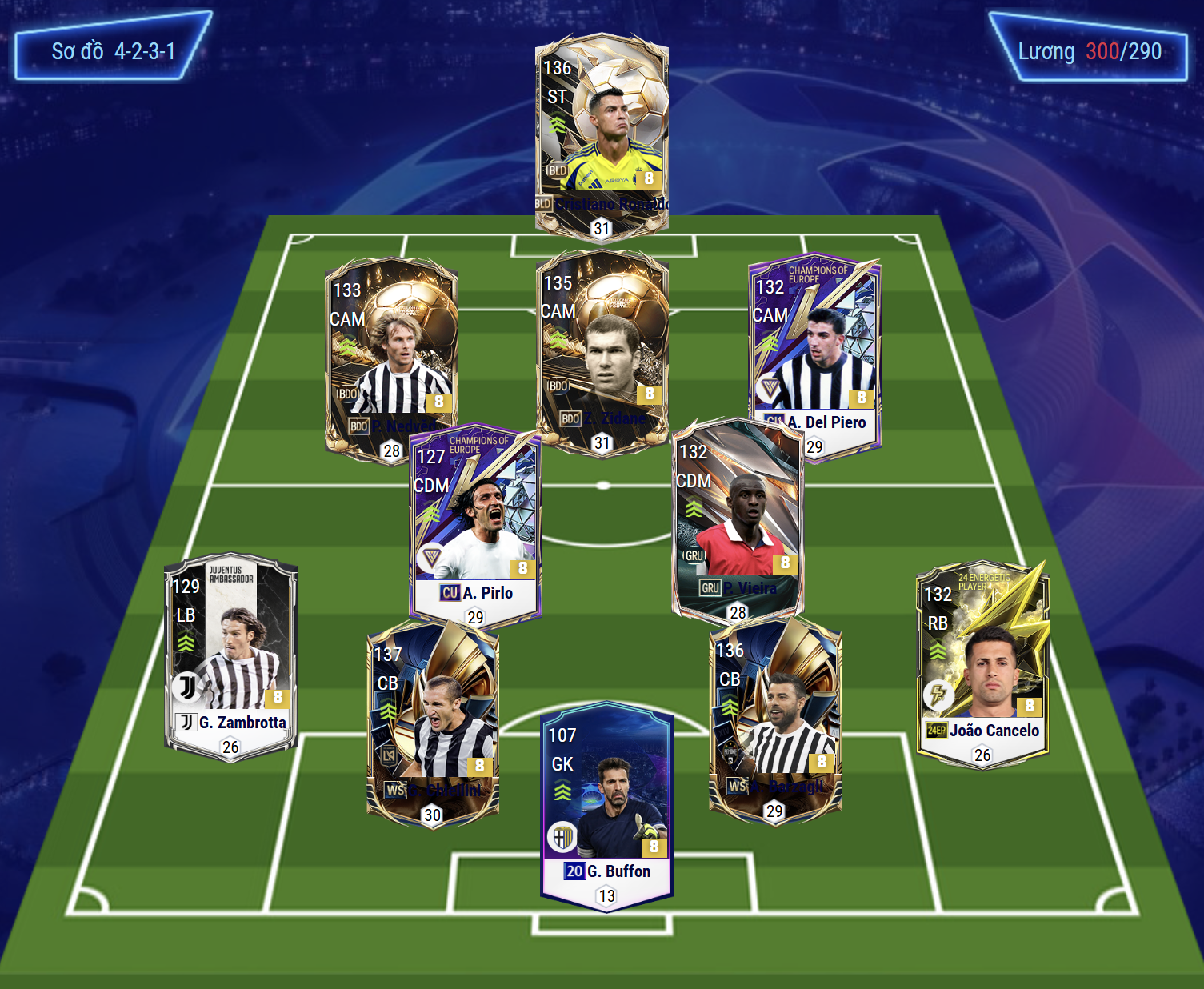 Sơ đồ 4231 được lựa chọn với vị trí tiền đạo cắm là Cristiano Ronaldo, anh là một trong những tiền đạo toàn diện hàng đầu game thời điểm hiện tại, Hỗ trợ phía sau là Zidane, cầu thủ người Pháp là cái tên đa năng ở vị trí tấn công cùng khả năng kiến tạo chất lượng. Cặp tiền vệ công lệch cánh Nedved và Del Piero sẽ có xu hướng chơi bám biên nhiều hơn và tham gia trực tiếp vào những tình huống tấn công biên từ rê dắt, xâm nhập cho tới tạt bóng.