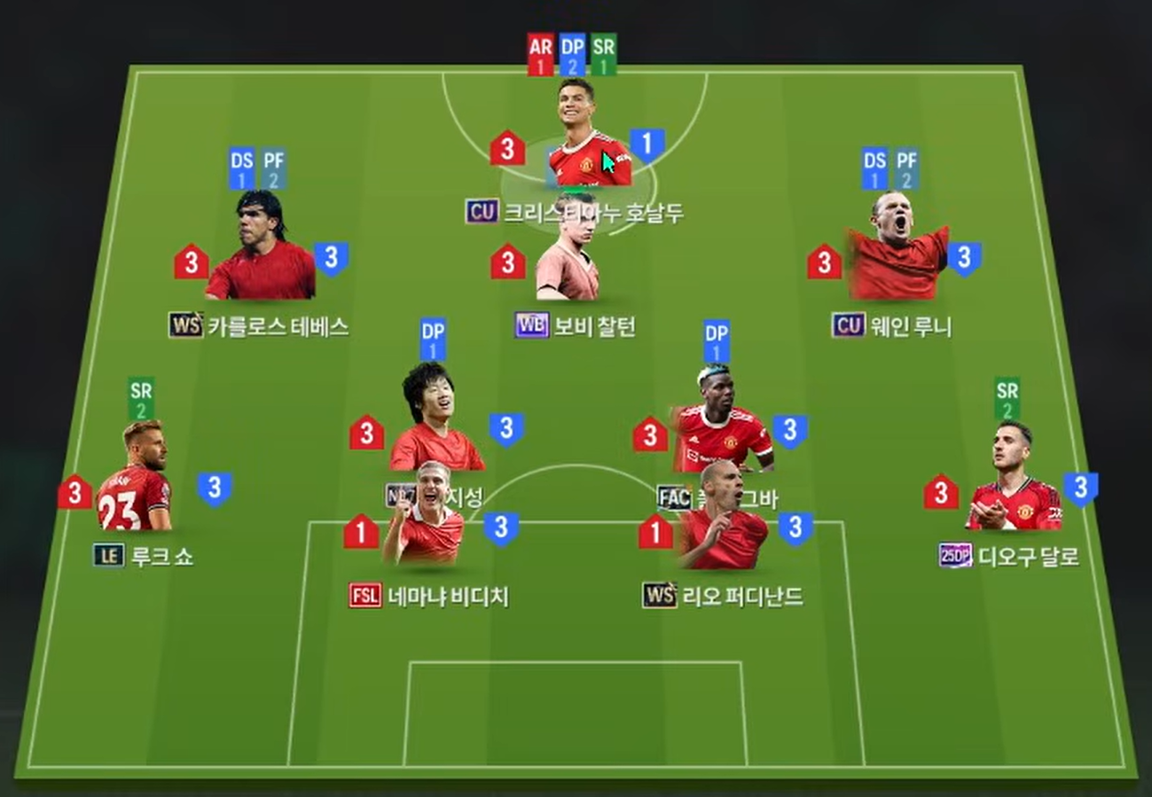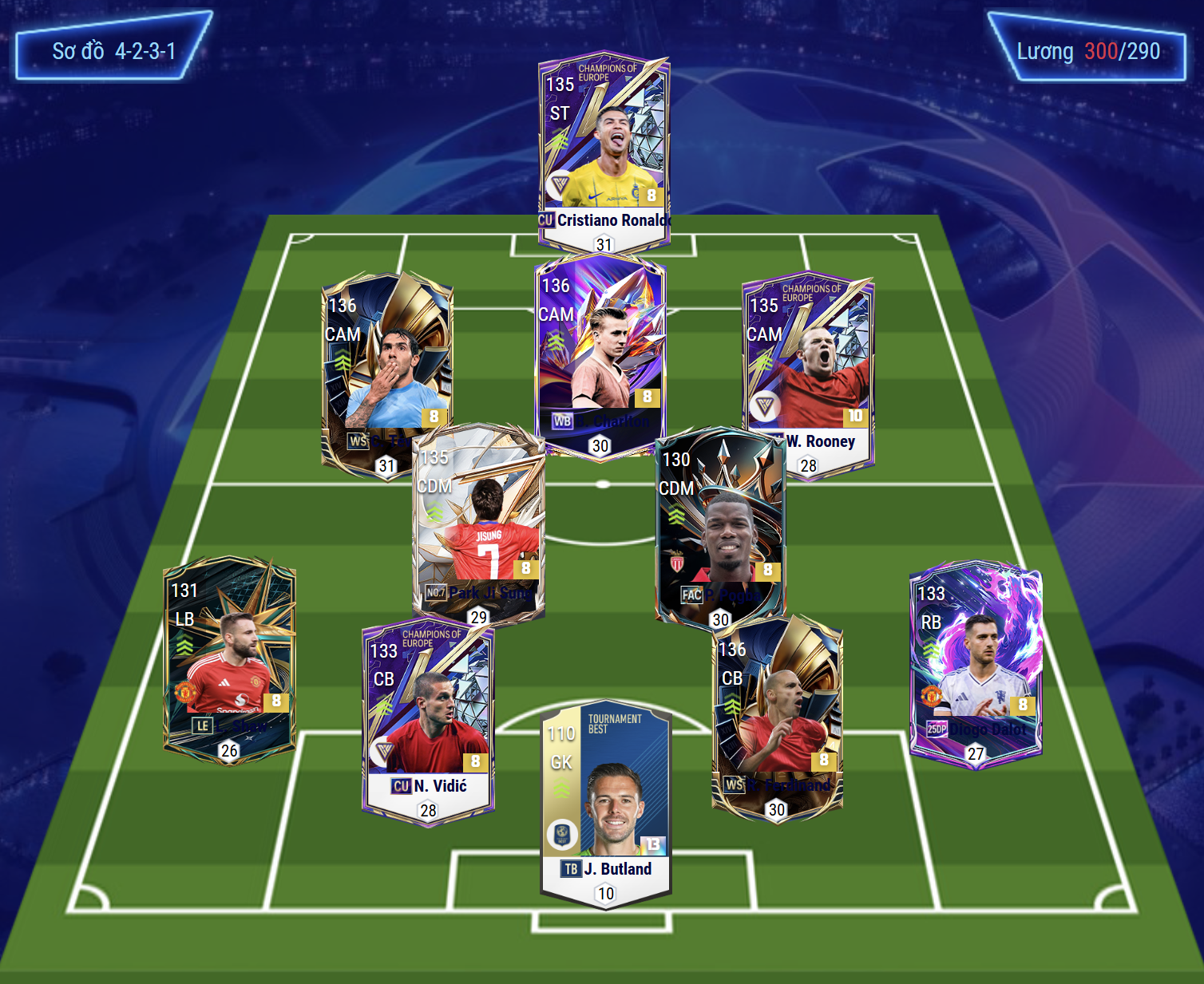 Sơ đồ 4231 được lựa chọn với vị trí tiền đạo cắm là Cristiano Ronaldo, cầu thủ người Bồ có khả năng dứt điểm toàn diện, không chiến hiệu quả cùng AI di chuyển thông minh. Hỗ trợ phía sau là bộ 3 tiền vệ tấn công LAM, CAM và RAM lần lượt là 3 cái tên Tevez, Charlton, Rooney trong đó Tevez và Rooney sẽ chơi hơi dạt cánh trong khi Charlton lại bám sâu vào trung lộ và hỗ trợ trực diện cho CR7 hơn.