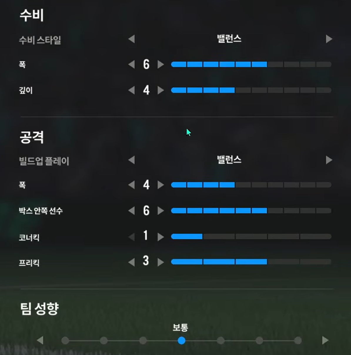 Trong khi, thiết lập tấn công "cân bằng" sẽ phù hợp cho lối chơi kiểm soát bóng, triển khai thế trận chậm, chắc ở tuyến giữa và ban bật với các vệ tinh trên hàng công để mở ra khoảng trống và ghi bàn. Ở lối chơi tấn công này, xu hướng triển khai sẽ là xu hướng chậm, chắc bóng và tìm kiếm cơ hội thay vì tấn công tổng lực và tốc độ cao.