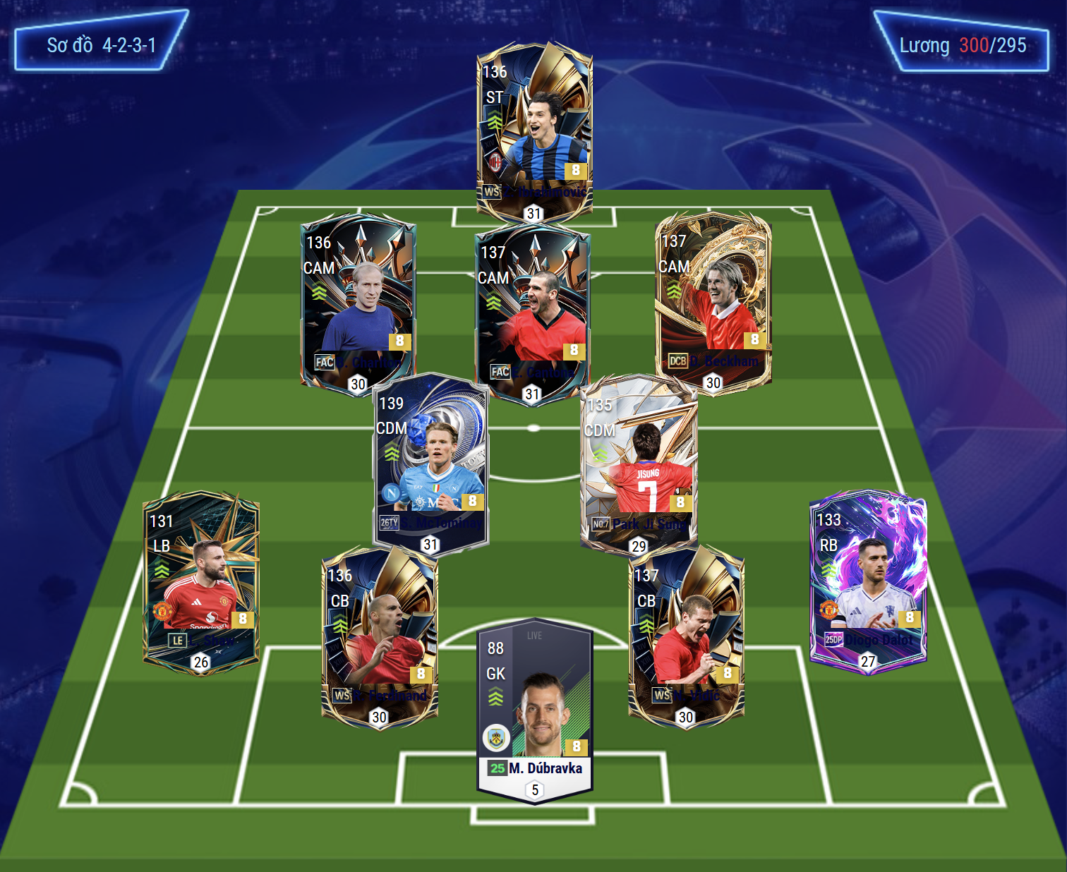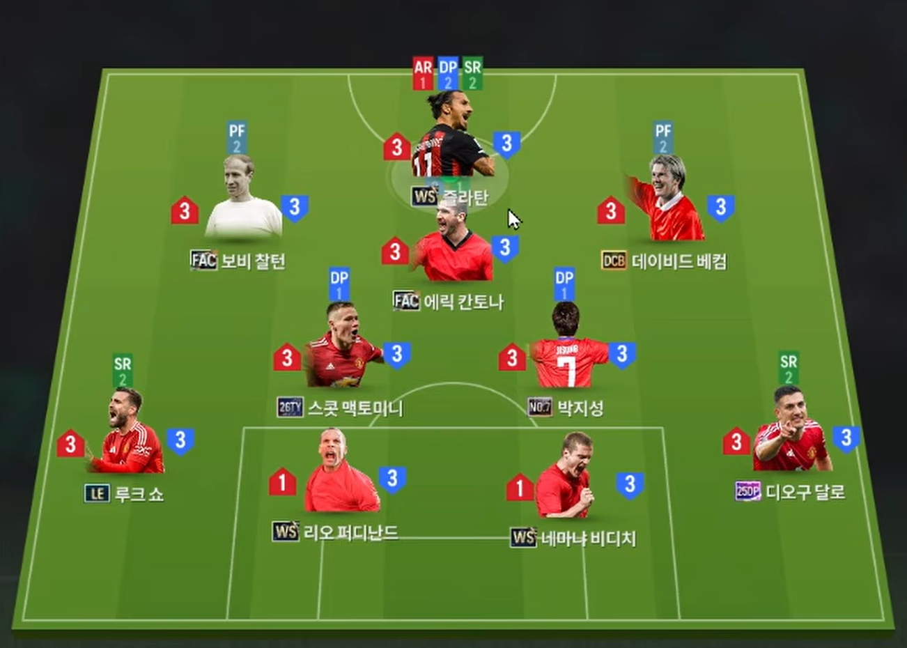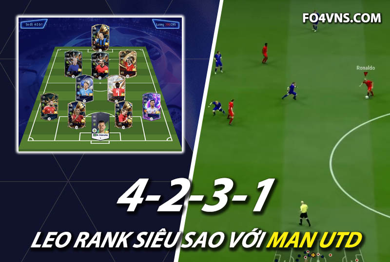 Sơ đồ 4231 được lựa chọn cho team color Man Utd với vị trí tiền đạo cắm là Ibrahimovic, tiền đạo cắm được lựa chọn sở hữu khả năng dứt điểm cực kì sắc bén, kỹ năng không chiến tốt cùng AI di chuyển lẫn tì đè nổi bật. Bộ 3 tiền vệ tấn công LAM, CAM và RAM lần lượt là Charlton, Cantona, Beckham trong đó Charlton và Beckham sẽ có xu hướng bám biên nhiều hơn trong khi Cantona sẽ đá như 1 hộ công thực thụ hỗ trợ trực tiếp cho tiền đạo phía trên.