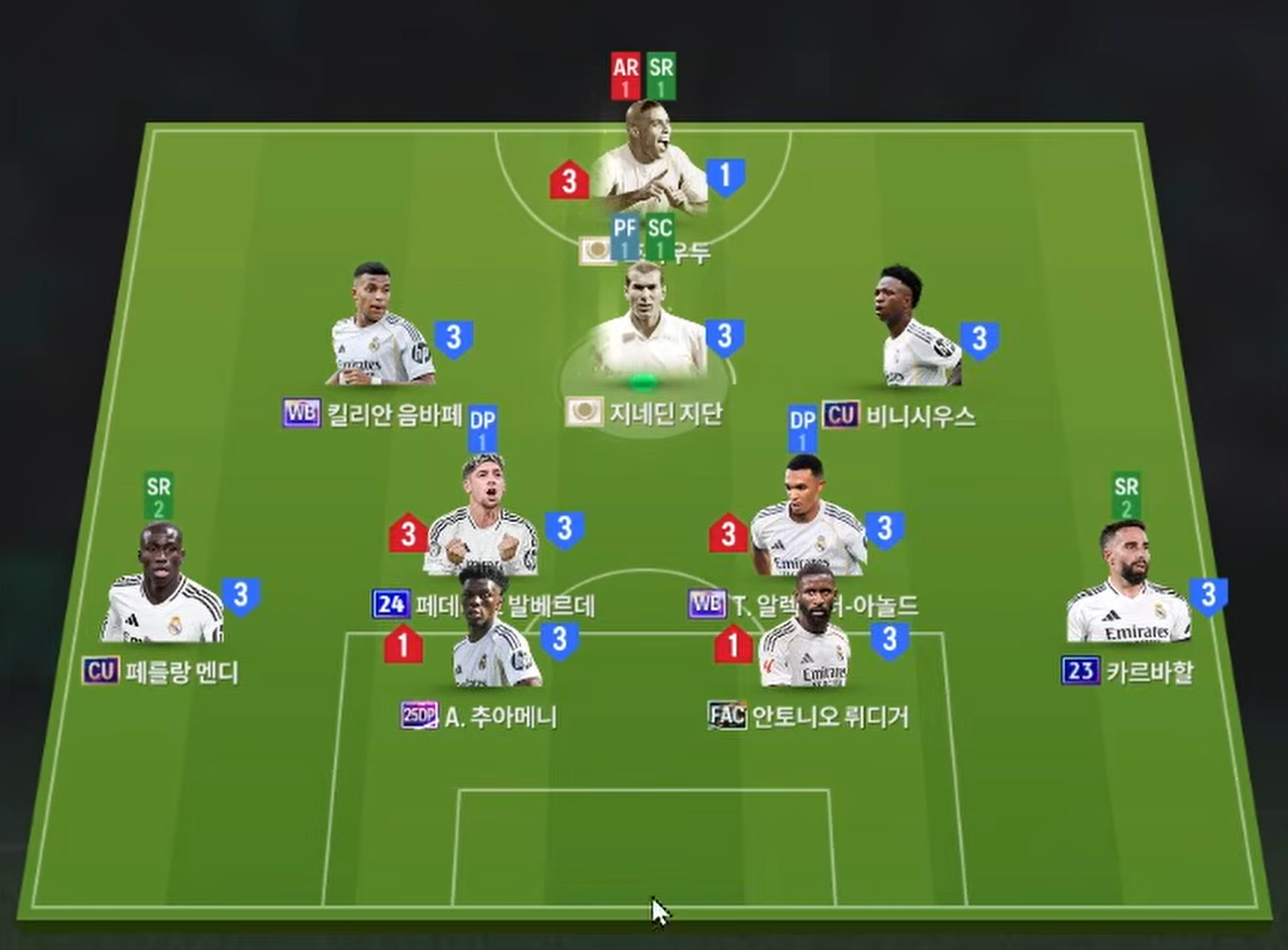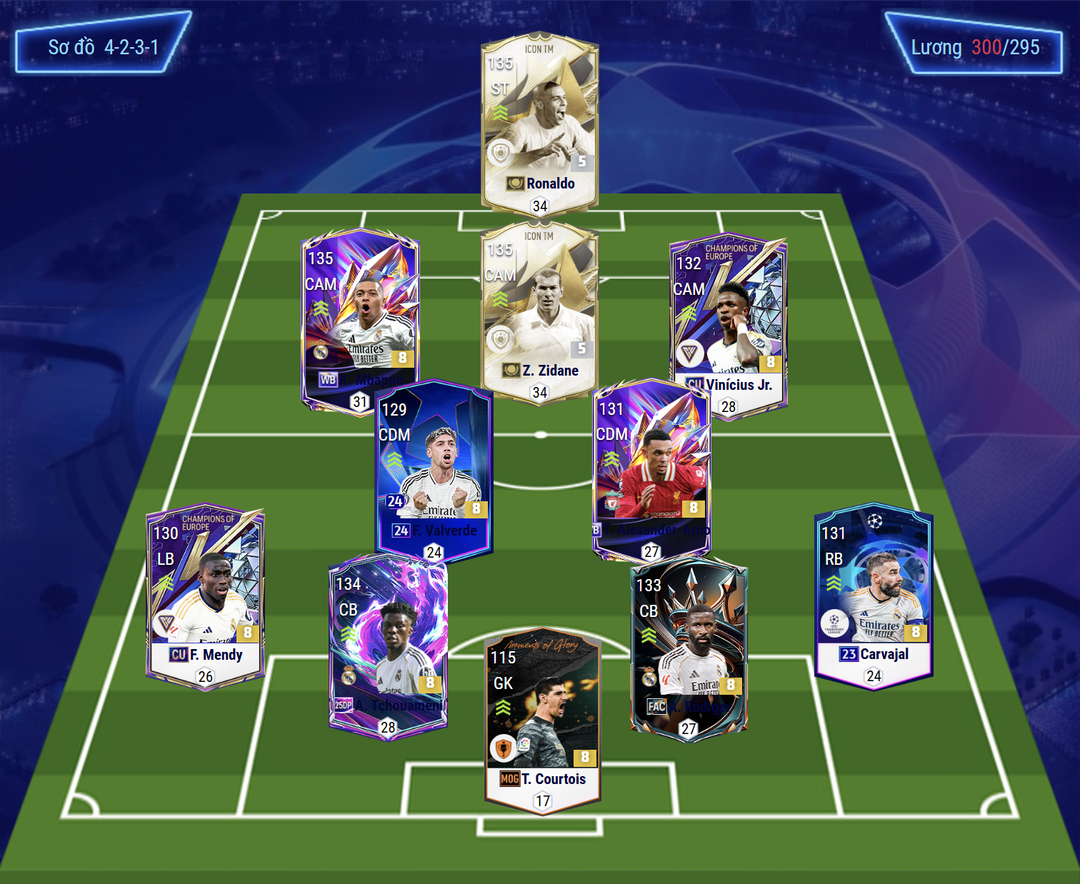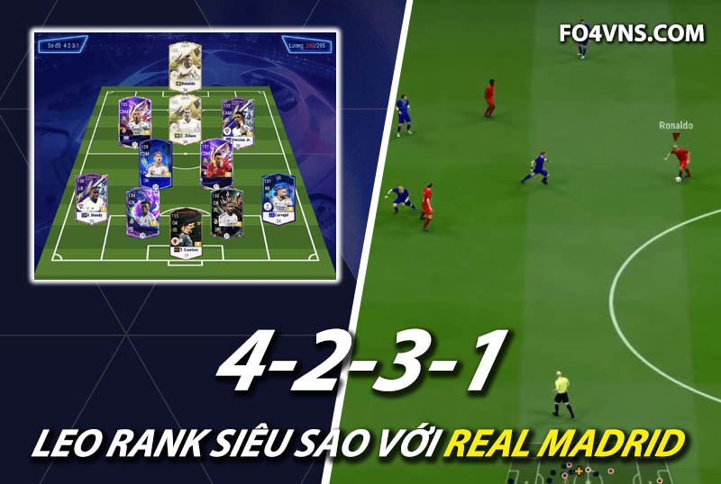 Sơ đồ 4231 được lựa chọn cho team color Real Madrid với vị trí tiền đạo cắm là Ronaldo de lima, cầu thủ người Brazil là mẫu tiền đạo toàn diện, hiệu quả trong khả năng dứt điểm bằng cả 2 chân. Hỗ trợ phía sau là bộ 3 tiền vệ tấn công Mbappe, Zidane và Vinicius trong đó Mbappe và Vini có xu hướng chơi bám biên nhiều hơn, xâm nhập vòng cấm cũng như hỗ trợ hiệu quả. Trong khi Zidane thi đấu bám giữa nhiều hơn vừa hỗ trợ tấn công vừa tham gia ghi bàn.