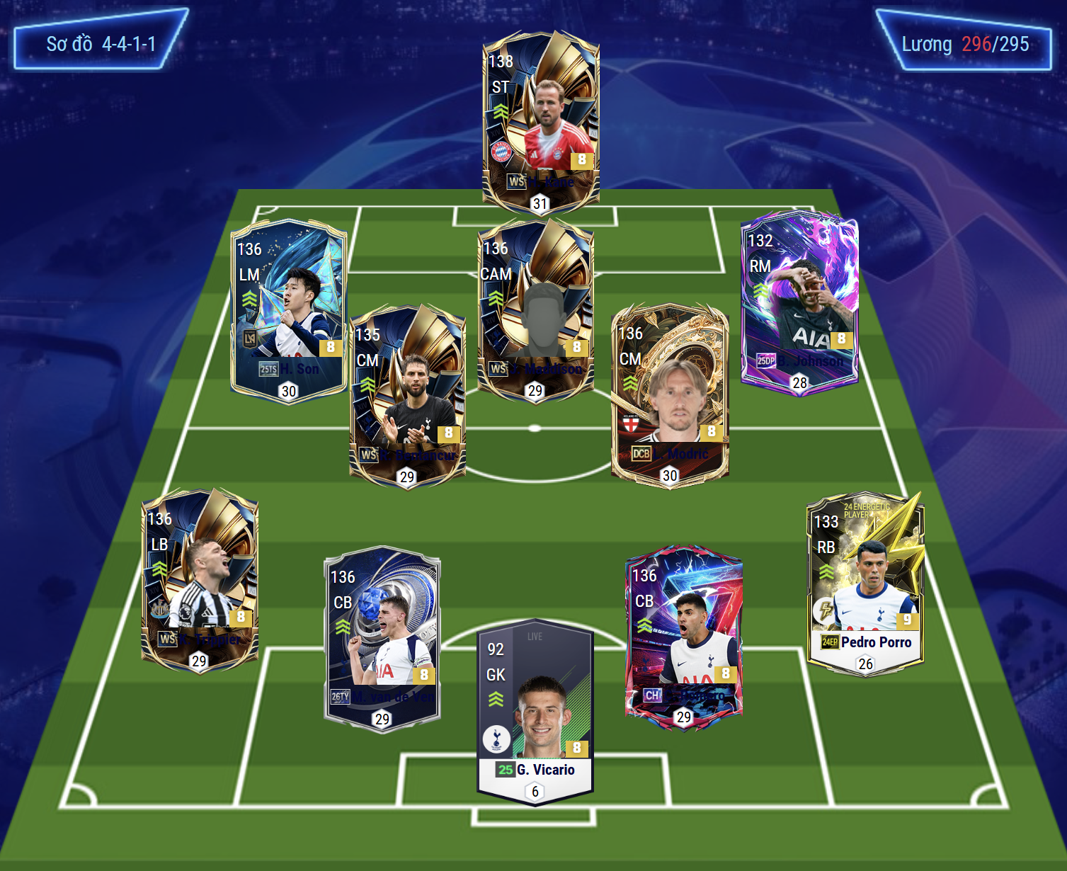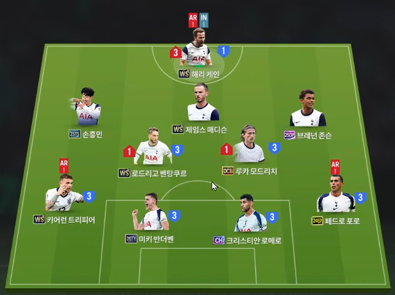 Sơ đồ chiến thuật được lựa chọn cho team color Tottenham là sơ đồ 4411 với tiền đạo cắm là Harry Kane, cầu thủ người Anh cho thấy hiệu quả ở khả năng dứt điểm nổi bật, kỹ năng không chiến tốt cùng với đó là làm tường kiến tạo cực kì hay cho các pha phối hợp tấn công. Hỗ trợ phía sau là Maddison cho vị trí tiền vệ tấ công, cầu thủ sở hữu khả năng phối hợp và sút bóng nổi bật.