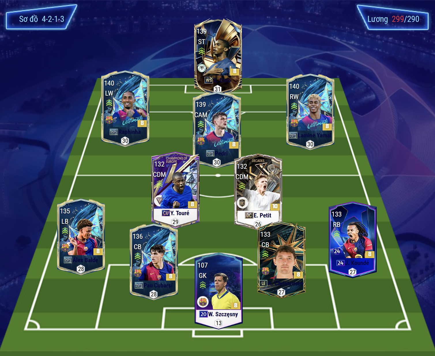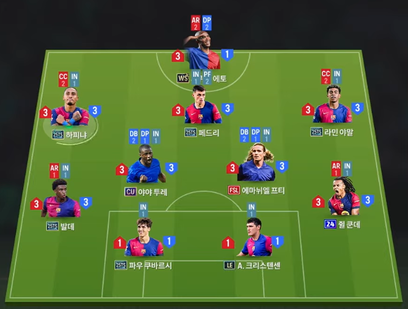 Sơ đồ 4213 được lựa chọn với vị trí tiền đạo cắm là Eto'o, cầu thủ sở hữu tốc độ, khả năng rê dắt cũng như dứt điểm cực kì nổi bật. Hai bên là cặp tiền đạo cánh Raphinha và Yamal, cả 2 sở hữu tốc độ, kỹ năng rê dắt tốt cùng khả năng chuyền tạt cho tới dứt điểm đều rất ổn.