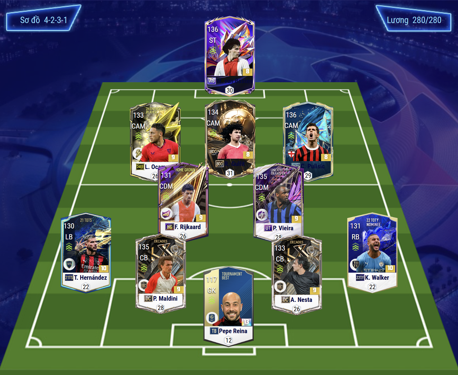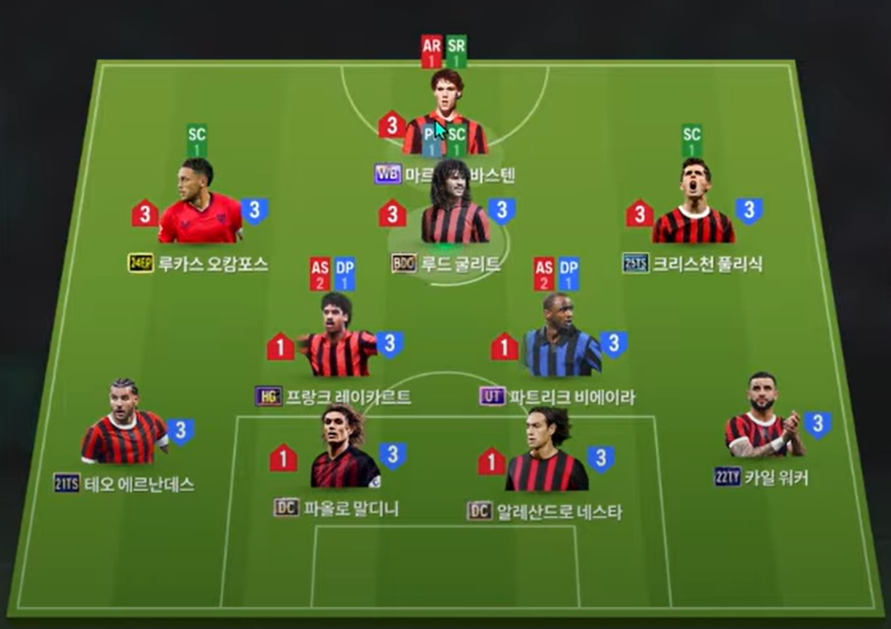 Sơ đồ được lựa chọn lần này cho team color AC Milan là sơ đồ 4231 đang khá thịnh hành ở meta hiện tại. Vị trí chơi cao nhất trên hàng công là Basten, tiền đạo sở hữu khả năng dứt điểm khá toàn diện bằng cả 2 chân từ cận thành, sút xa, ZD cho tới những pha không chiến. Hỗ trợ phía sau là bộ 3 tiền vệ tấn công LAM, CAM và RAM lần lượt là Ocampos, Gullit và Pulisic. Cả 3 đều là những mẫu cầu thủ đa năng có tốc độ tốt, khả năng chuyền tạt ấn tượng cùng bộ kỹ năng dứt điểm đa dạng.