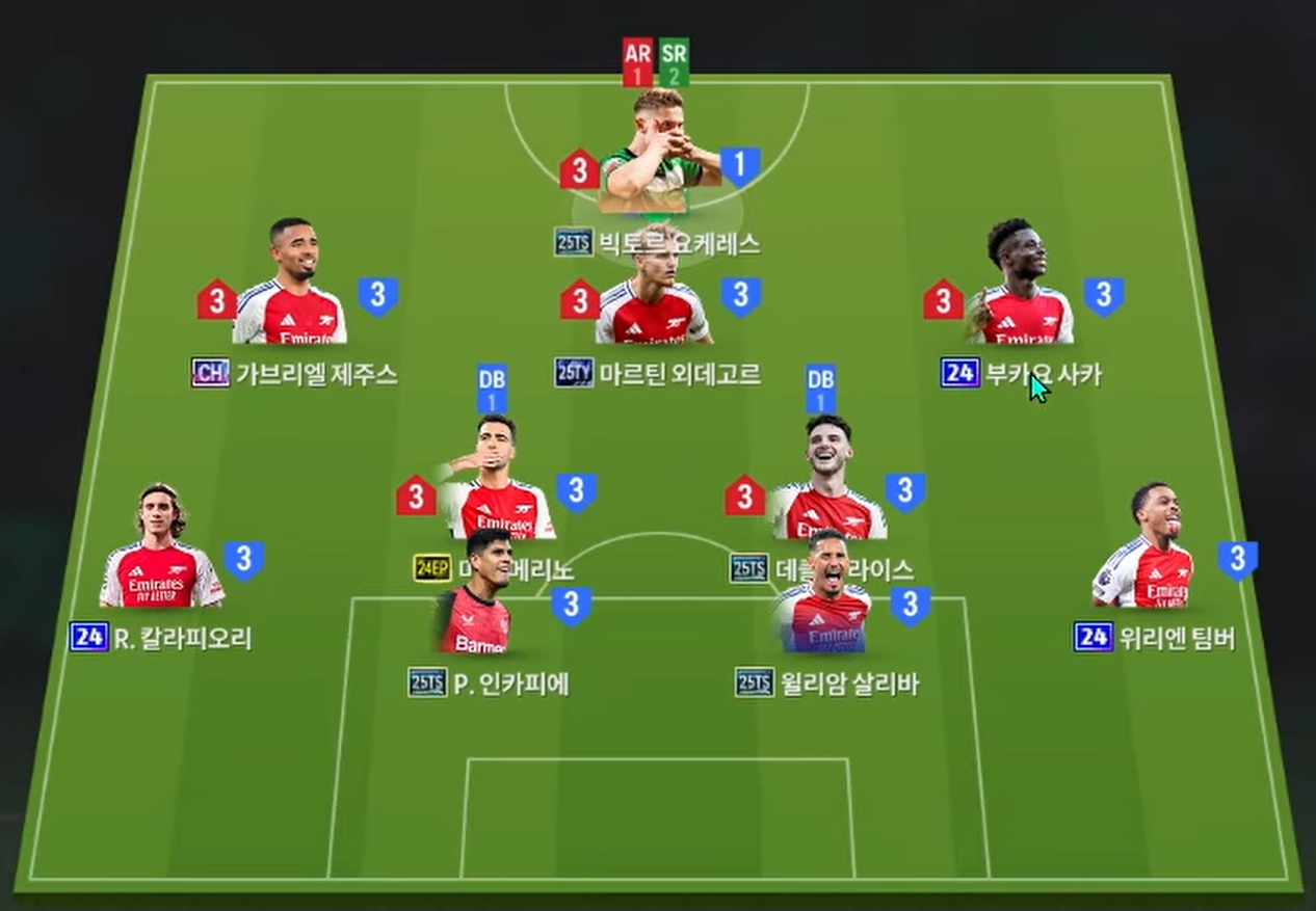 Sơ đồ 4231 được lựa chọn với vị trí tiền đạo cắm là Gyokeres, một trong những tiền đạo có kỹ năng dứt điểm tốt, thể hình ấn tượng và được kì vọng rất lớn tại Arsenal hiện tại. Hỗ trợ phía sau là 3 cái tên Jesus, Odegaard và Saka. Cả 3 đều là những cái tên sở hữu tốc độ ổn, khả năng di chuyển chuyền tạt cho đến dứt điểm xâm nhập đều ở mức tốt phù hợp cho 3 vị trí LAM, CAM và RAM.