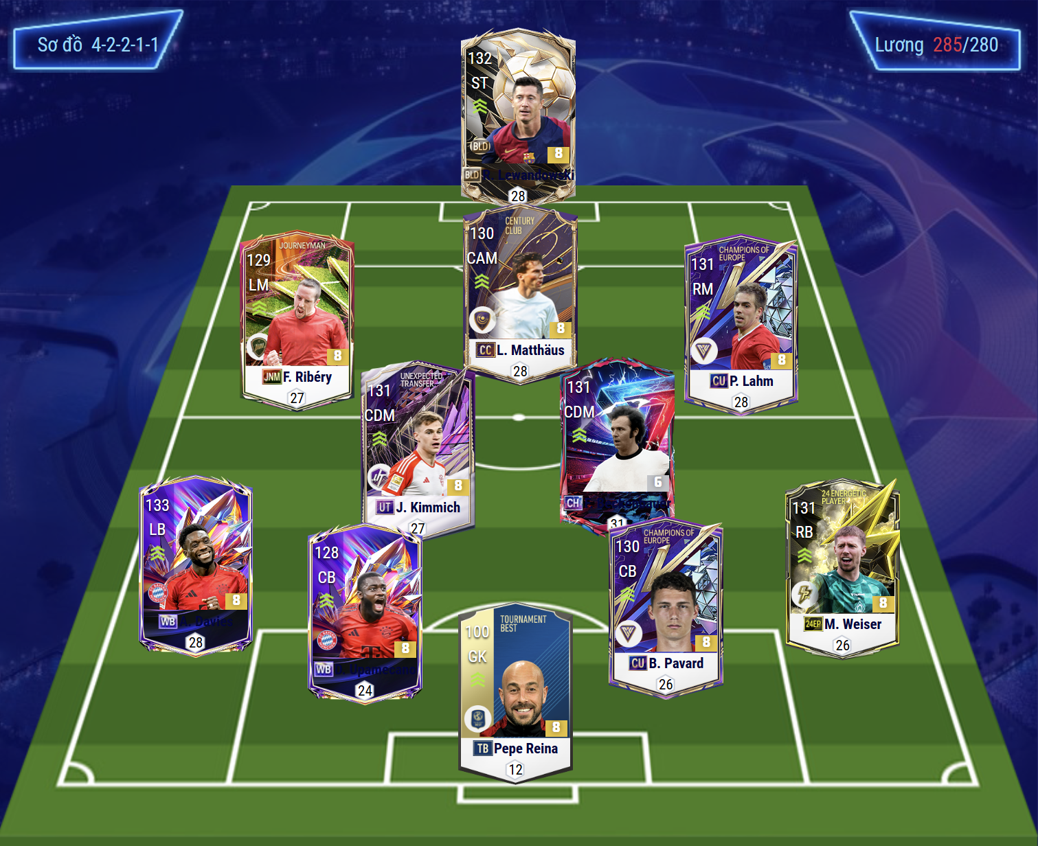 Sơ đồ 42211 được lựa chọn với vị trí tiền đạo cắm là Lewandowski, đây là một trong những tiền đạo toàn diện ở khâu dứt điểm từ những tình huống sút cận thành, sút xa, ZD bằng cả 2 chân cho tới không chiến đều rất tốt. Hỗ trợ phía sau là Matthaus, tiền vệ tấn công sở hữu sự đa năng từ chuyền bóng, sút xa, ban bật cho đến tranh chấp đều ổn.