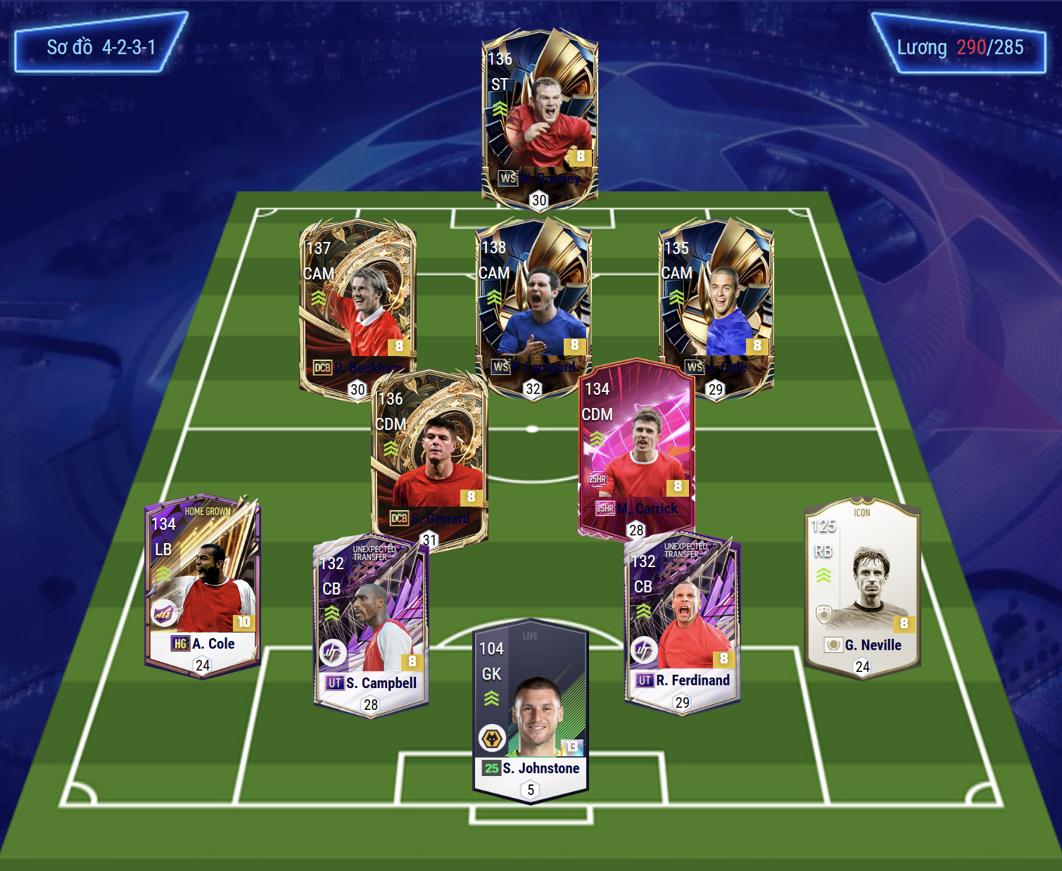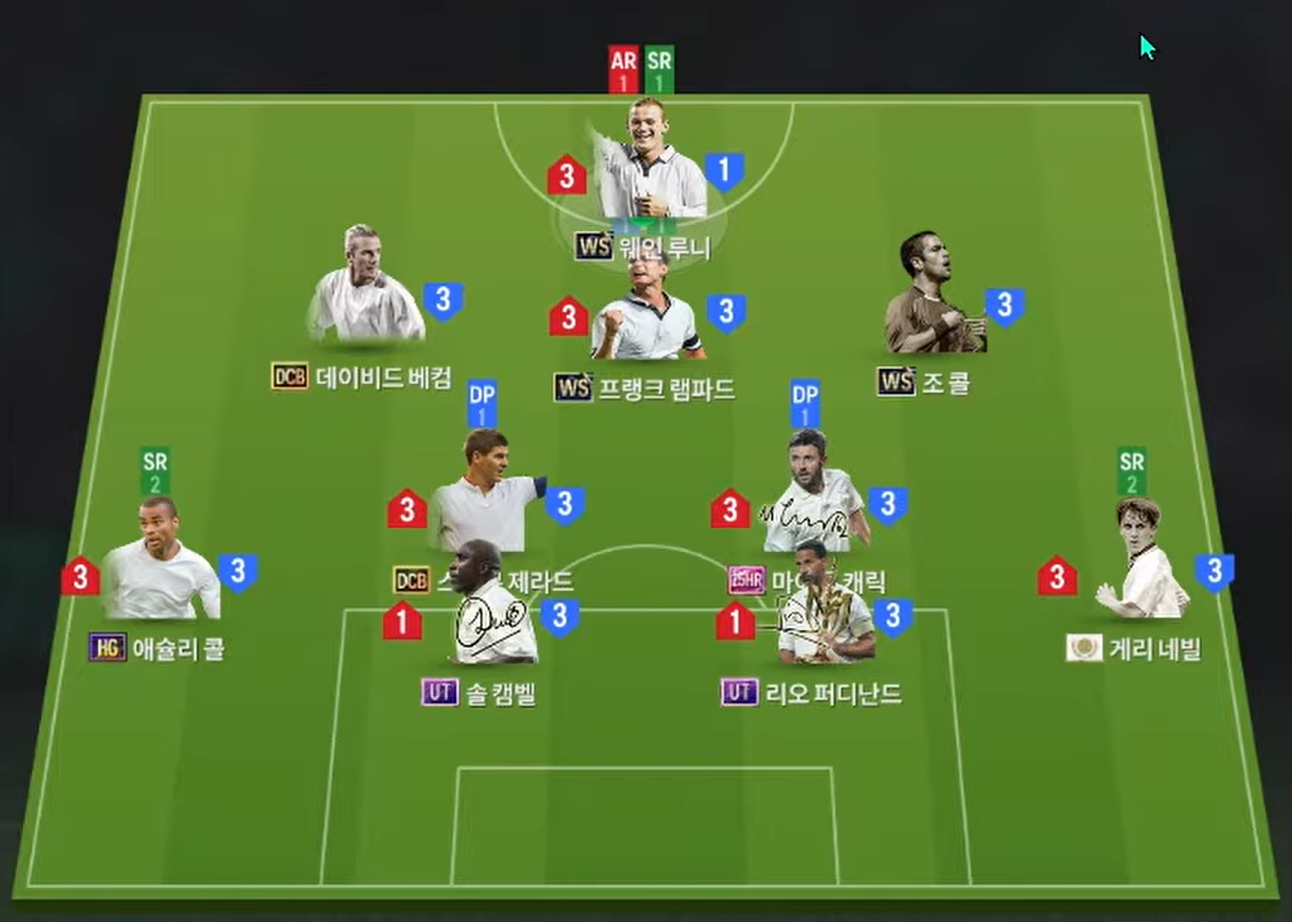Sơ đồ 4231 được lựa chọn với vị trí tiền đạo cắm là Rooney, cựu cầu thủ Man Utd cho thấy hiệu quả ở khả năng dứt điểm ấn tượng ở trong lẫn ngoài vòng cấm, khả năng tì đè cùng AI di chuyển khôn sẽ giúp cho những tình huống phối hợp trở nên hiệu quả. Bộ 3 tiền vên công Beckham, Lampard và Joe Cole lần lượt cho 3 vị trí LAM, CAM và RAM trong đó Beckham và J.Cole sẽ bám biên nhiều hơn trong khi Lampard trở thành tiền vệ tấn công chính hỗ trợ ngay sau tiền đạo.