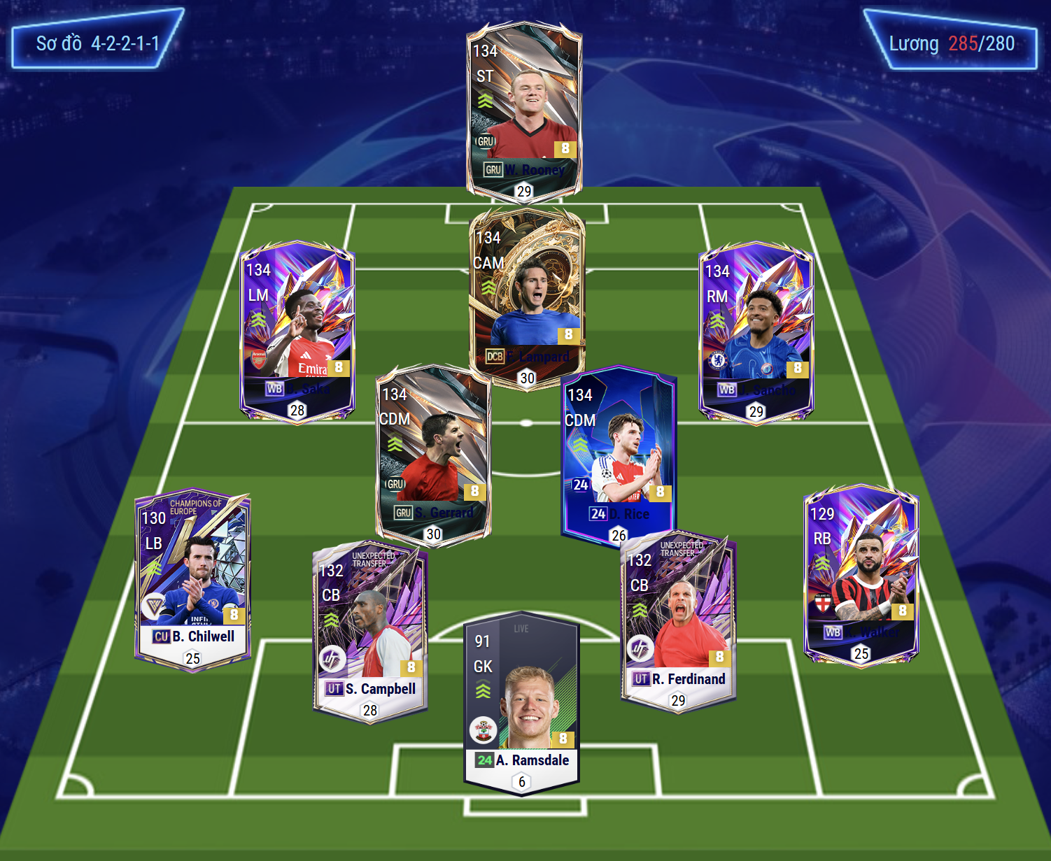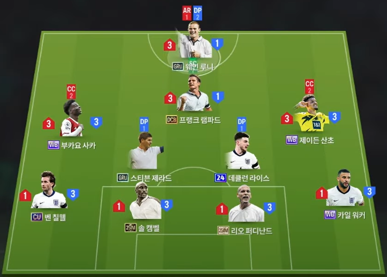 Sơ đồ 42211 được lựa chọn với vị trí tiền đạo cắm là Rooney, đây là một trong những cái tên chất lượng sở hữu thể hình to khỏe, kỹ năng dứt điểm đa dạng và hiệu quả bằng cả 2 chân. Hỗ trợ phía sau là Lampard, một trong những tiền vệ tấn công sở hữu khả năng sút xa ấn tượng và chuyền bóng hiệu quả. Cặp tiền vệ cánh Saka và Sancho sở hữu tốc độ, khả năng chuyền bóng ấn tượng cùng kỹ năng rê dắt nổi bật.