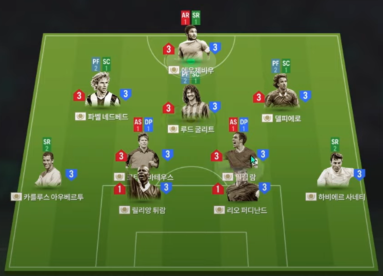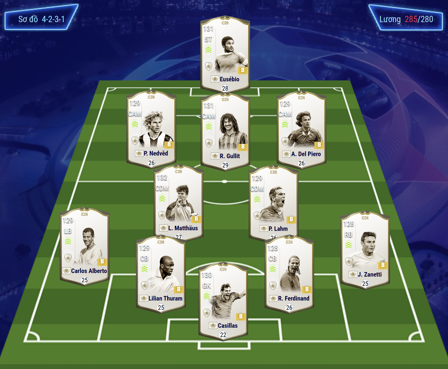 Sơ đồ 4231 là sơ đồ được lựa chọn với vị trí tiền đạo cắm là Eusebio, một trong những tiền đạo sở hữu tốc độ, khả năng dứt điểm toàn diện bằng cả 2 chân chính là điểm mạnh phù hợp với meta hiện tại. Hỗ trợ phía sau là bộ 3 tiền vệ tấn công Nedved, Gullit và Del Piero lần lượt cho 3 vị trí LAM, CAM và RAM. Cả 3 cái tên đều là những cái tên toàn diện từ tốc độ, khả năng chuyền tạt tốt cho tới sút xa đều ấn tượng.