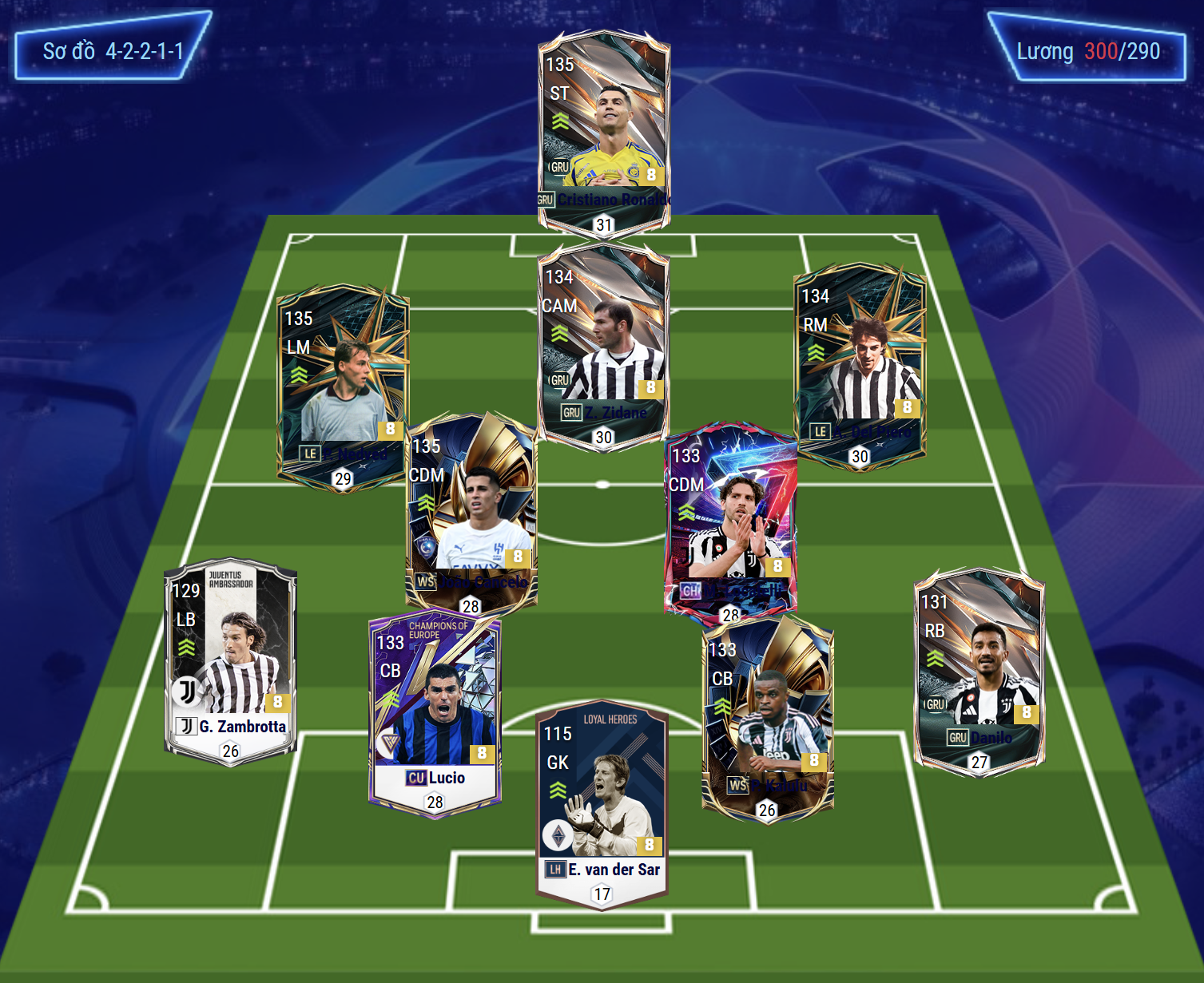 Sơ đồ 42211 được lựa chọn với trung phong chơi cao nhất trên hàng công là Cristiano Ronaldo cho vị trí tiền đạo cắm sở hữu tốc độ, khả năng dứt điểm nổi bật cùng bộ kỹ năng xoay sở xử lý khá hiệu quả. Hỗ trợ phía sau là Zidane cũng là một trong những mẫu tiền vệ hàng đầu với khả năng dứt điểm tuyến 2 ấn tượng, kỹ năng rê dắt tốt, khả năng chuyền bóng và phối hợp với các vệ tinh xung quanh hiệu quả.