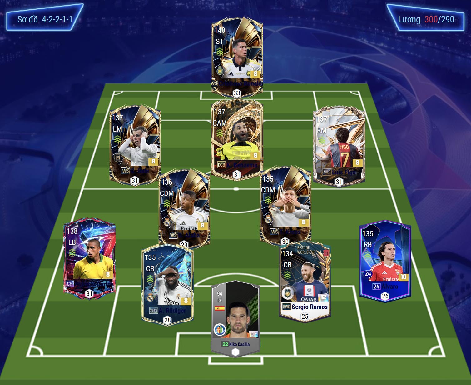 Bộ tứ vệ với Carlos và Alvaro thi đấu ở 2 bên hành lang biên, cả 2 có tộc độ tốt, khả năng lên tham gia tấn công ổn cùng với đó là ỹ năng tranh chấp tắc bóng phòng ngự khá hiệu quả. Cặp trung vệ Rudiger và Ramos đều sở hữu tốc độ, khả năng tranh chấp cắt bóng cũng như xoay sở cực tốt ở meta hiện tại. Thủ môn Kiko là cái tên được tin dùng trong khung gỗ.