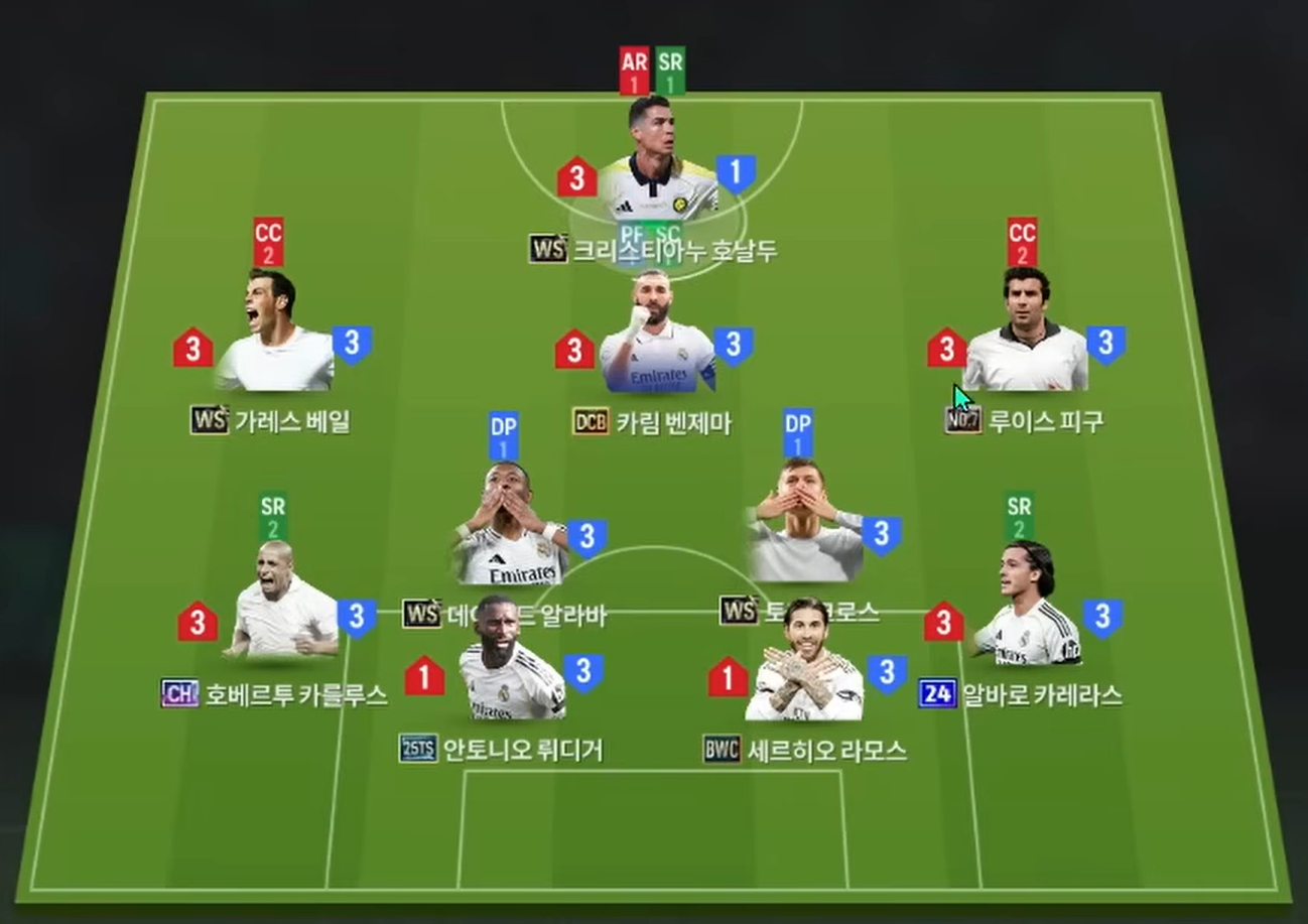 Sơ đồ được lựa chọn là 42211 cho team color Real Madrid với vị trí tiền đạo cắm là Cristiano Ronaldo, cầu thủ người Bồ sở hữu tốc độ, khả năng dứt điểm đa dạng cùng AI di chuyển thông minh. Hỗ trợ phía sau là Benzema cho vai trò tiền vệ công, ở trong sơ đồ này Benzema sẽ đá như một hộ công vừa phối hợp chuyền bóng vừa xâm nhập ghi bàn hoặc sút xa khi cần.
