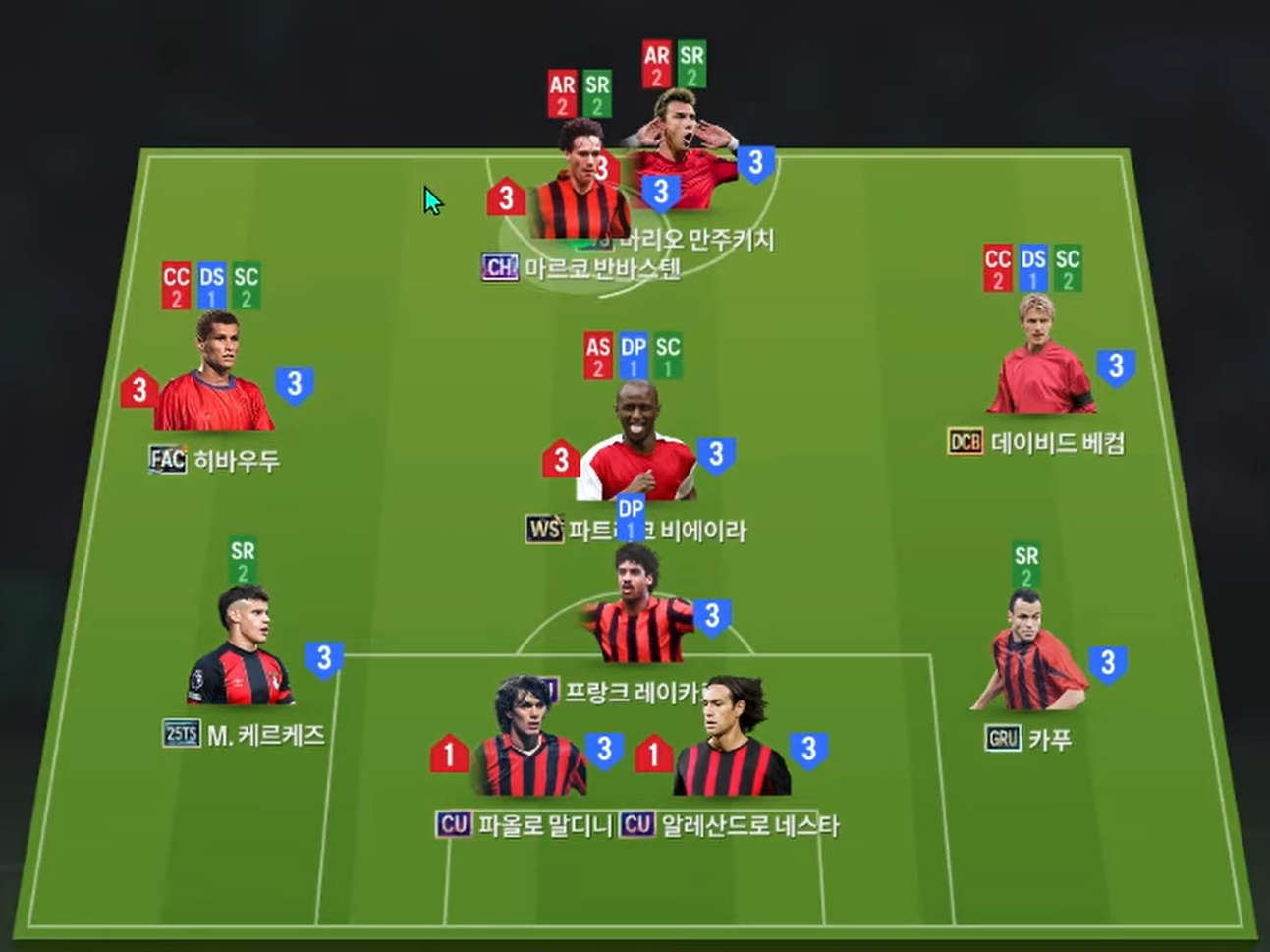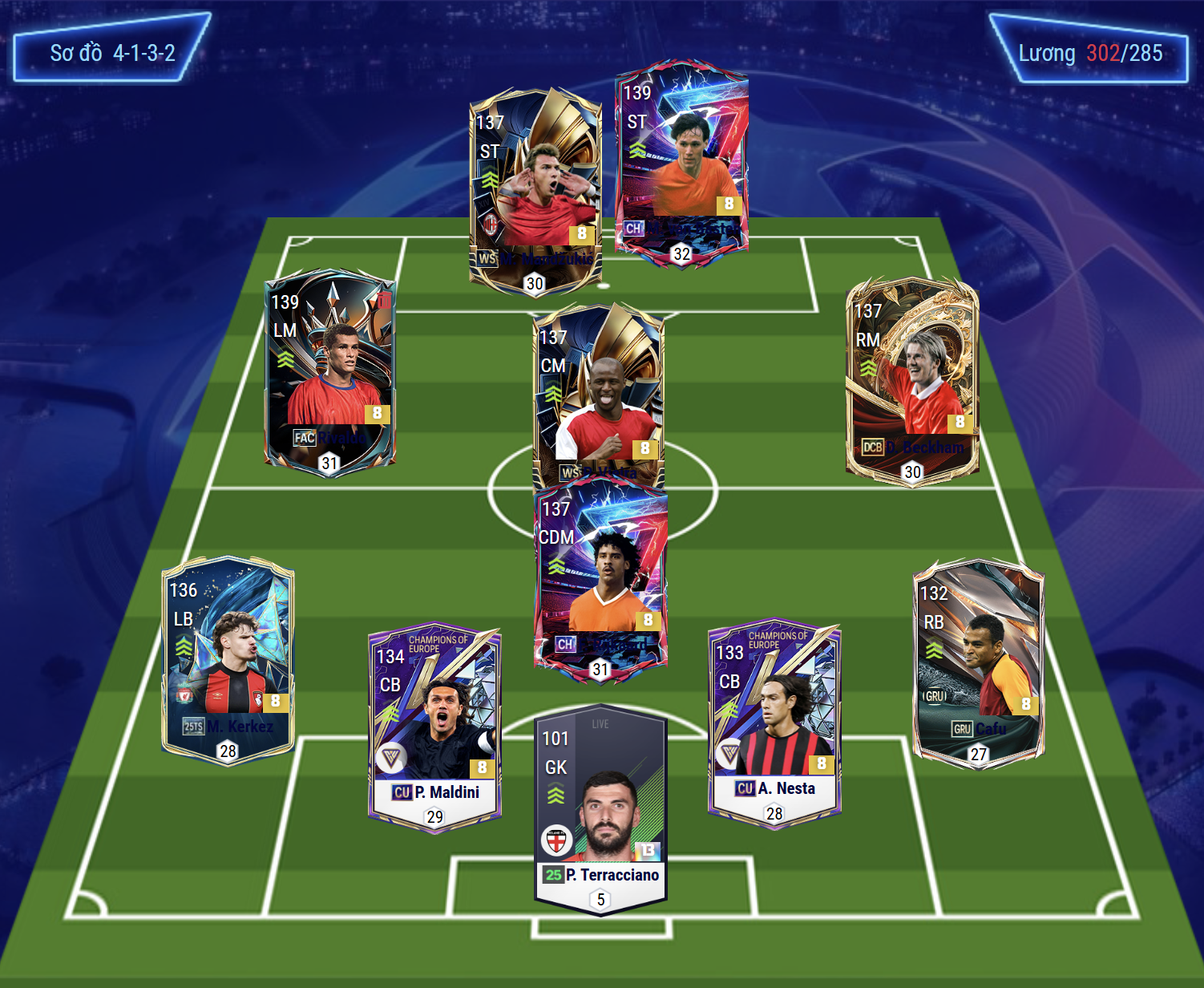 Sơ đồ 4132 này là dạng sơ đồ có xu hướng chơi phối hợp tấn công biên và tạt bóng nhiều để tối ưu khả năng chọn vị trí cũng như không chiến của bộ đôi Marco Van Basten và Mandzukic. Cả 2 không chỉ giỏi không chiến mà còn có khả năng dứt điểm ở trong lẫn ngoài vòng cấm ấn tượng. Hỗ trợ ở 2 bên hành lang biên là 2 chân tạt cực kì uy tín Rivaldo và Beckham, cả 2 đều có 2 chiếc chân thuận cực kì uy tín ở khả năng chuyền tạt cho tới sút xa ở ngoài khu vực biên. Tốc độ tốt và khả năng xử lý bóng ở mức ổn cũng là điểm mạnh của cặp đôi này.