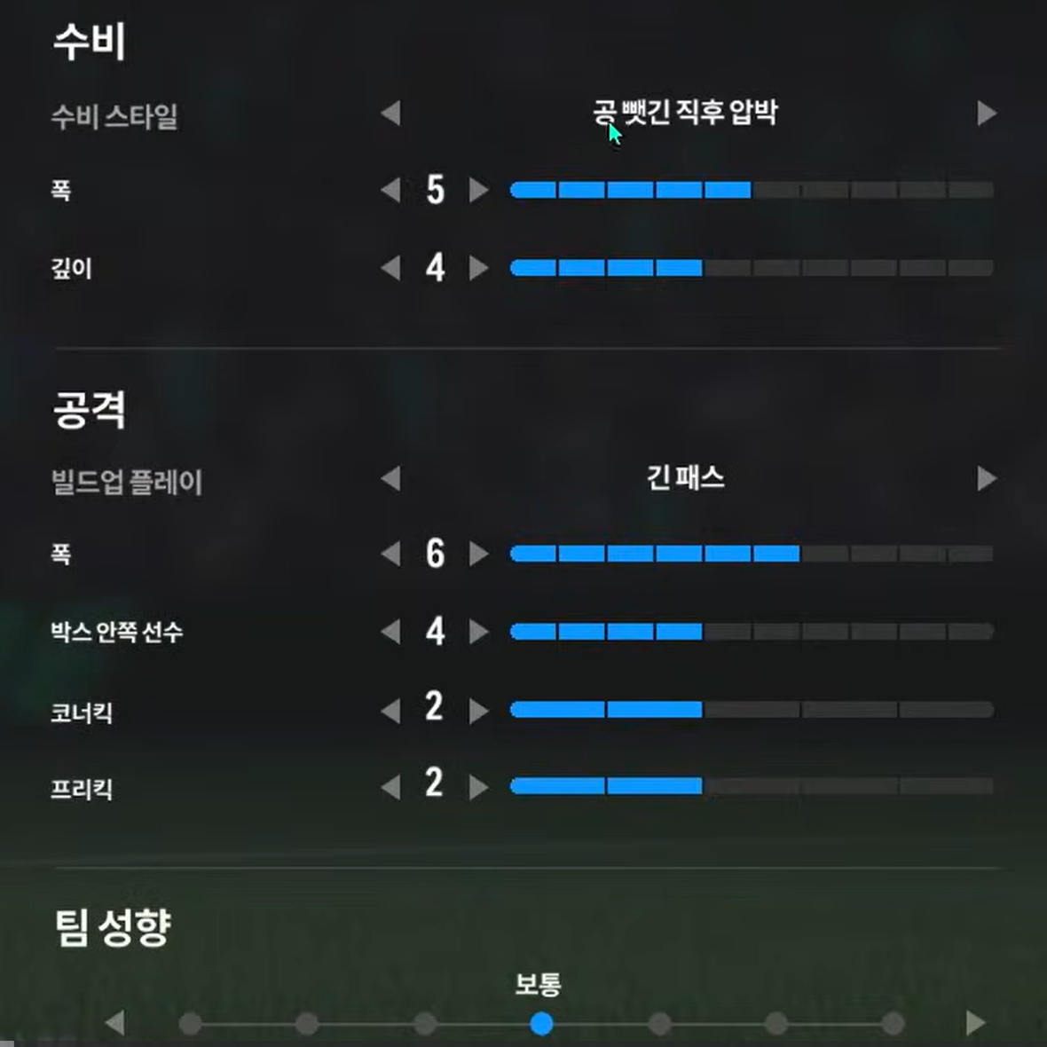 Thiết lập phòng ngự "áp lực ngay khi mất bóng", kết hợp với xu hướng rộng 5 – thấp 4, giúp đội hình duy trì cự li hợp lý và chủ động áp sát đối phương. Cách bố trí này tạo nên một nền tảng phòng ngự chủ động và hiệu quả, cho phép người chơi cướp bóng của đối thủ từ ngay phàn sân đối phương, tạo áp lực để làm chậm nhịp tấn công của đối phương.