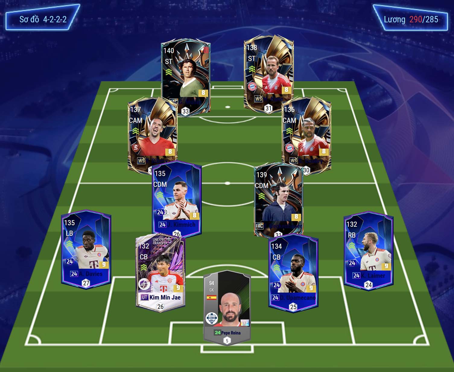 Sơ đồ 4222 được lựa chọn với vị trí tiền đạo cắm là cặp song sát Muller và Kane, cả 2 đều là những cây săn bàn chất lượng sở hữu tốc độ ổn, khả năng dứt điểm tốt bằng cả 2 chân cùng AI di chuyển phối hợp thông minh. Phía sau alf cặp tiền vệ công lệch cánh Ribery và Gnabry, cả 2 là những cái tên đa năng, sở hữu tốc độ, khả năng rê dắt nổi bật cùng bộ kỹ năng chuyền tạt tốt tạo nên hiệu quả tấn công đa dạng.