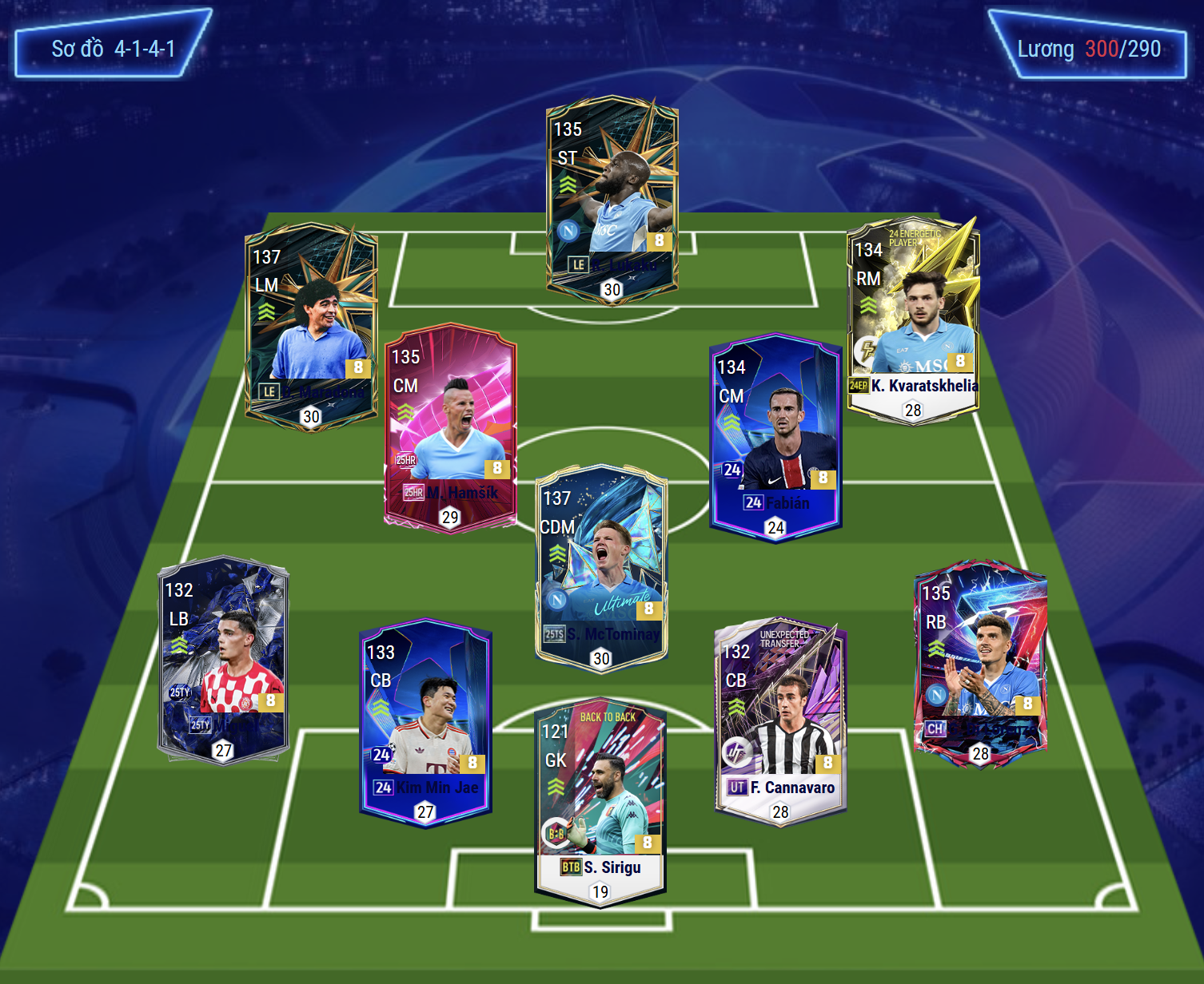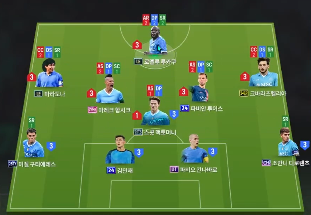 Sơ đồ được lựa chọn cho team color Napoli là sơ đồ 4141 với vị trí tiền đạo cắm là Lukaku, cầu thủ người Bỉ sở hữu thể hình, khả năng tranh chấp và dứt điểm cực kì tốt. Hỗ trợ phía sau là cặp tiền vệ cánh Maradona và Kvaratskhelia, cả 2 đều có tốc độ tốt, chuyền tạt hay và xâm nhập dứt điểm cũng cực kì chất lượng. Tiền vệ trung tâm Hamsik và Fabian là những cái tên đa năng vừa hỗ trợ phòng ngự ổn, vừa tham gia tấn công tốt, điều phối cầm nhịp hiệu quả.