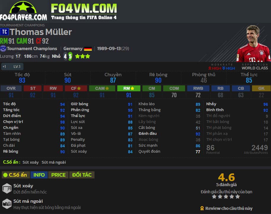 - Sút xa, ZD : Những tình huống sút xa của Muller có độ chính xác cao. Đặc biệt là những pha ZD bằng chân thuận bóng không chỉ cong mà có lực đi rất mạnh khiến thủ môn có rất ít cơ hội.