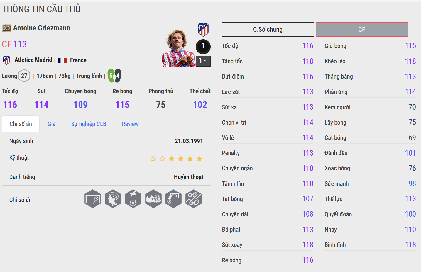 Griezmann LE là phiên bản nổi bật nhất nhờ sự hoàn thiện trong lối chơi. Anh sở hữu khả năng kiểm soát bóng rất tốt, di chuyển cực kỳ thông minh và tạo ra nhiều tình huống tấn công nguy hiểm. Những pha phối hợp nhanh, các đường chuyền sắc bén cùng khả năng dứt điểm ổn định giúp Griezmann LE trở thành trung tâm trong nhiều phương án tấn công của đội hình.