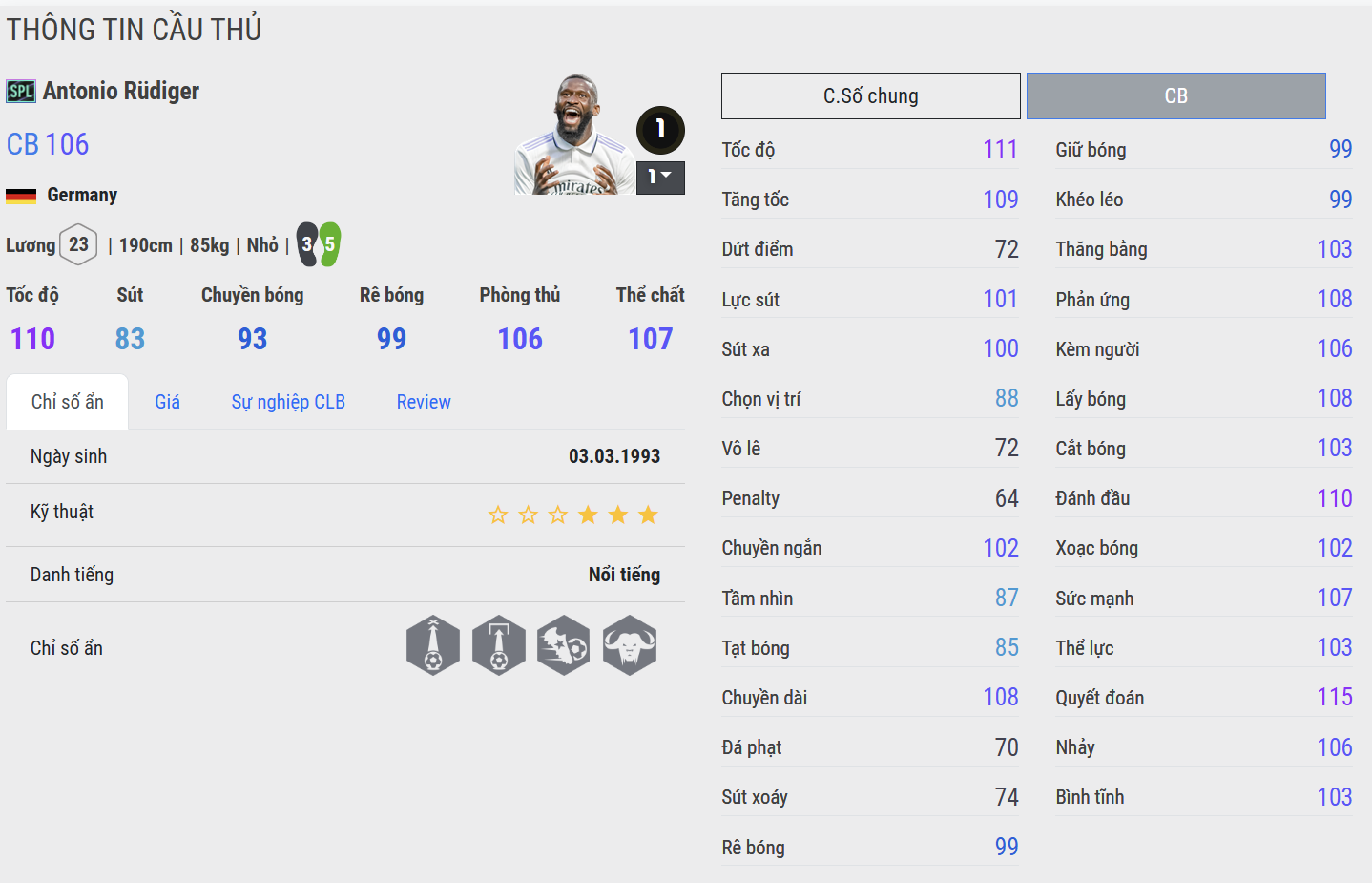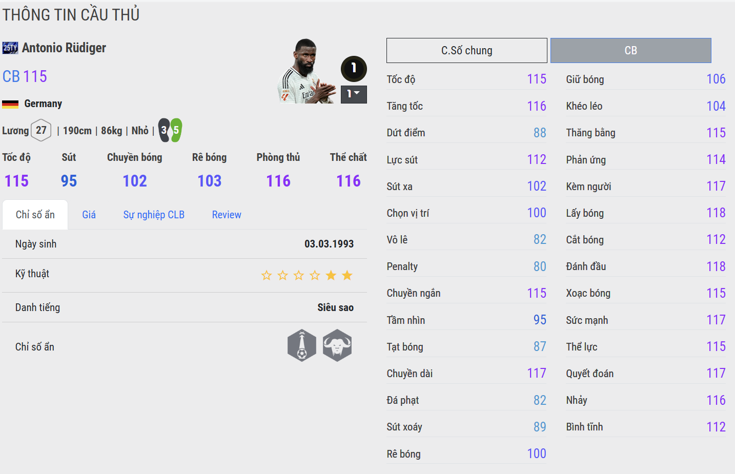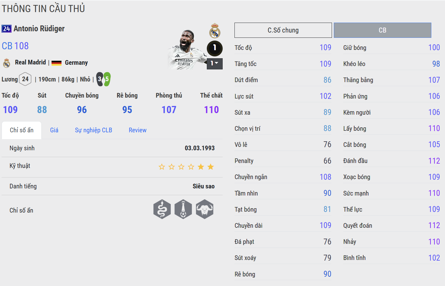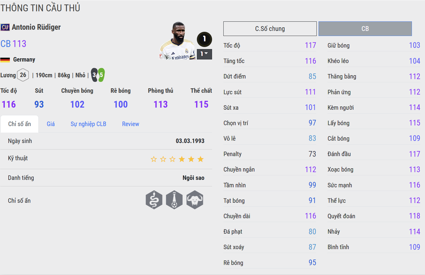 Trong FC Online, Rüdiger được yêu thích bởi lối chơi chắc chắn, phản xạ nhanh và khả năng đeo bám cực khó chịu. Anh là mẫu hậu vệ mà bất kỳ đội hình nào cũng cần – vừa là “bức tường” kiên cố, vừa là nguồn năng lượng bùng nổ ở tuyến dưới.