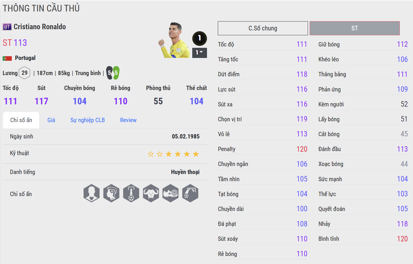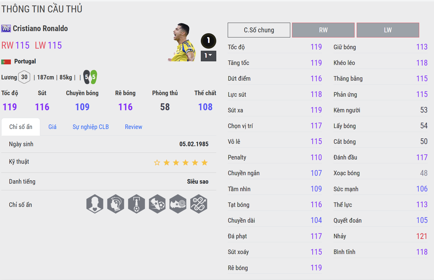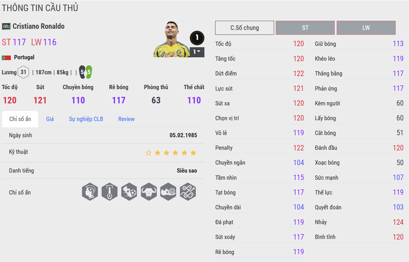 Ronaldo CU là phiên bản tiệm cận sự hoàn hảo với nền tảng thể chất vượt trội và khả năng tranh chấp mạnh mẽ. Những pha bật nhảy không chiến, dứt điểm cận thành và xử lý một chạm trong vòng cấm đều đạt độ hiệu quả rất cao. CU mang đến cảm giác chắc chắn và áp đảo, đặc biệt phù hợp cho vai trò trung phong cắm trong các đội hình ưu tiên tấn công trực diện.