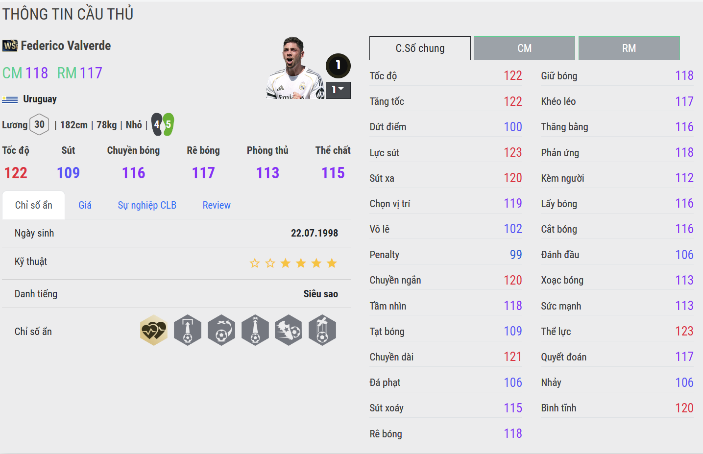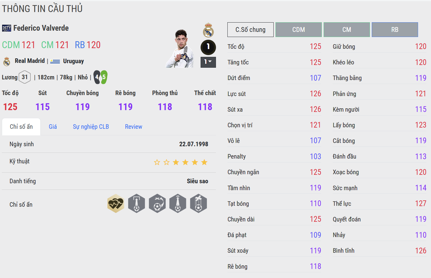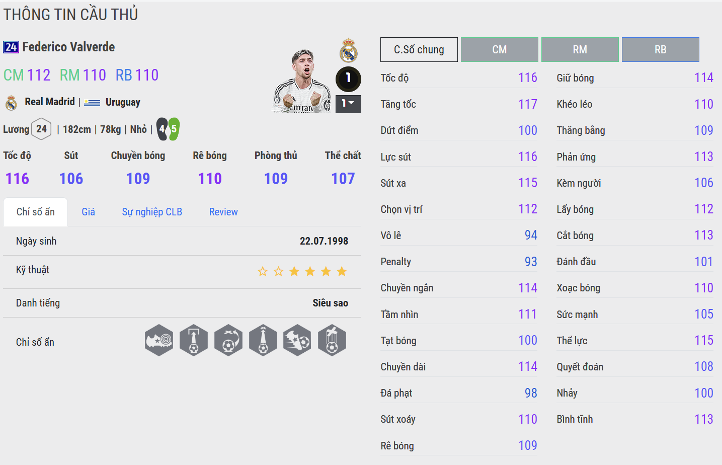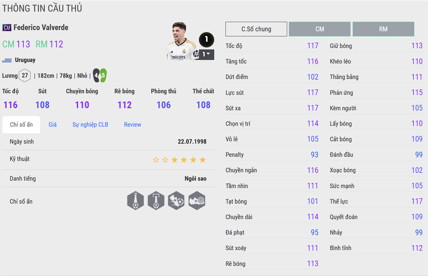 CU cải thiện rõ khả năng chuyền dài và tham gia tấn công. Valverde mùa này cho cảm giác chắc tay hơn khi cầm nhịp và chuyển trạng thái. Tuy nhiên, độ “đầm” trong va chạm và mức độ bùng nổ vẫn chưa đạt tới ngưỡng cao nhất.