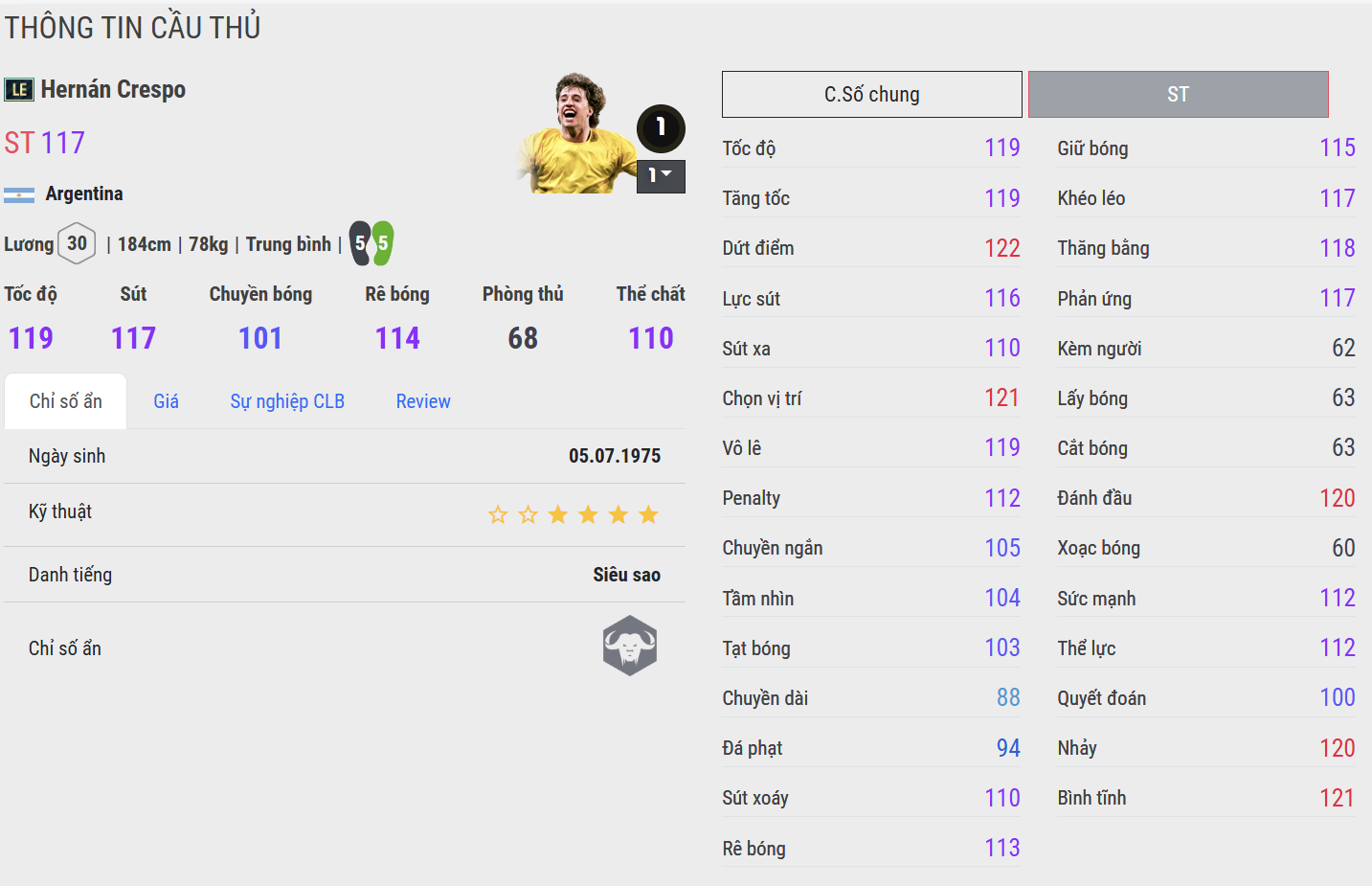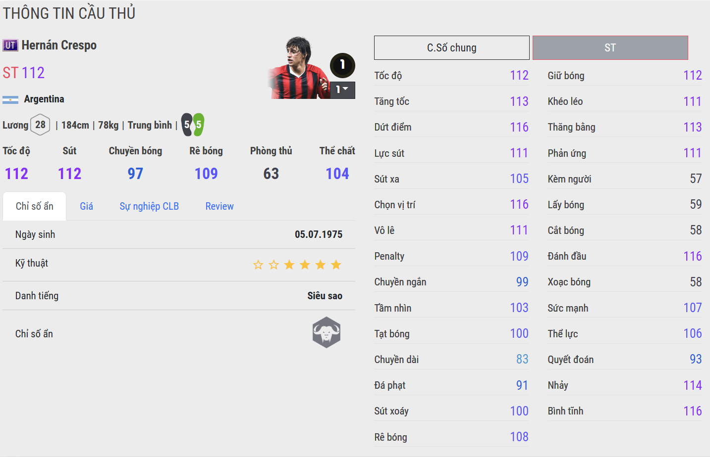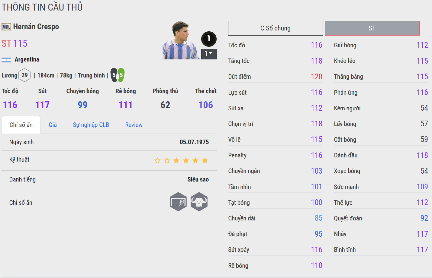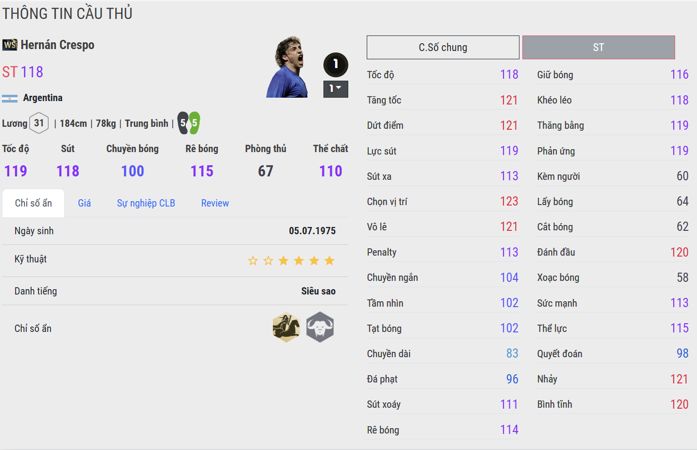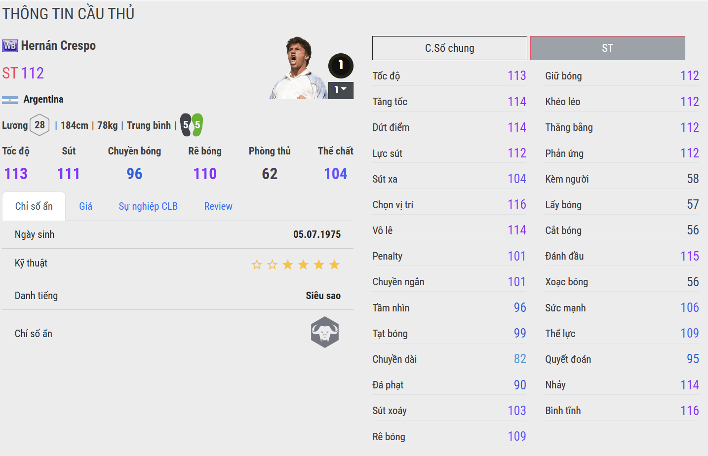 Crespo WB là phiên bản dễ tiếp cận, thể hiện rõ chất trung phong cổ điển với khả năng chọn vị trí và dứt điểm một chạm khá ổn. Anh hoạt động gọn trong vòng cấm, không cần nhiều không gian để tung ra cú sút. Phù hợp với người chơi cần một số 9 cắm đơn giản, hiệu quả và đúng chất “ăn sẵn”.