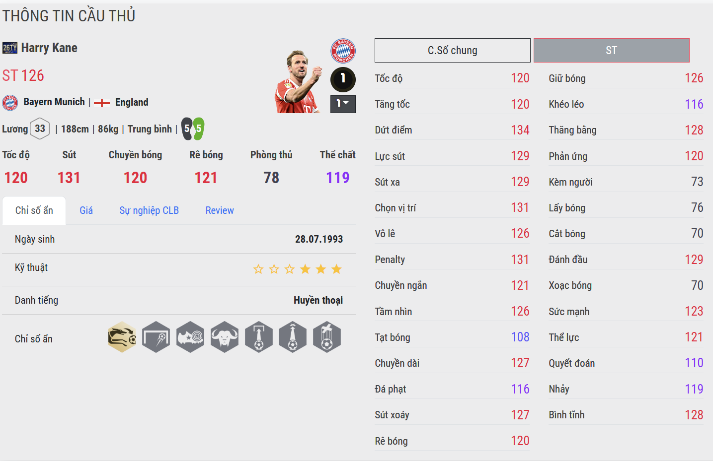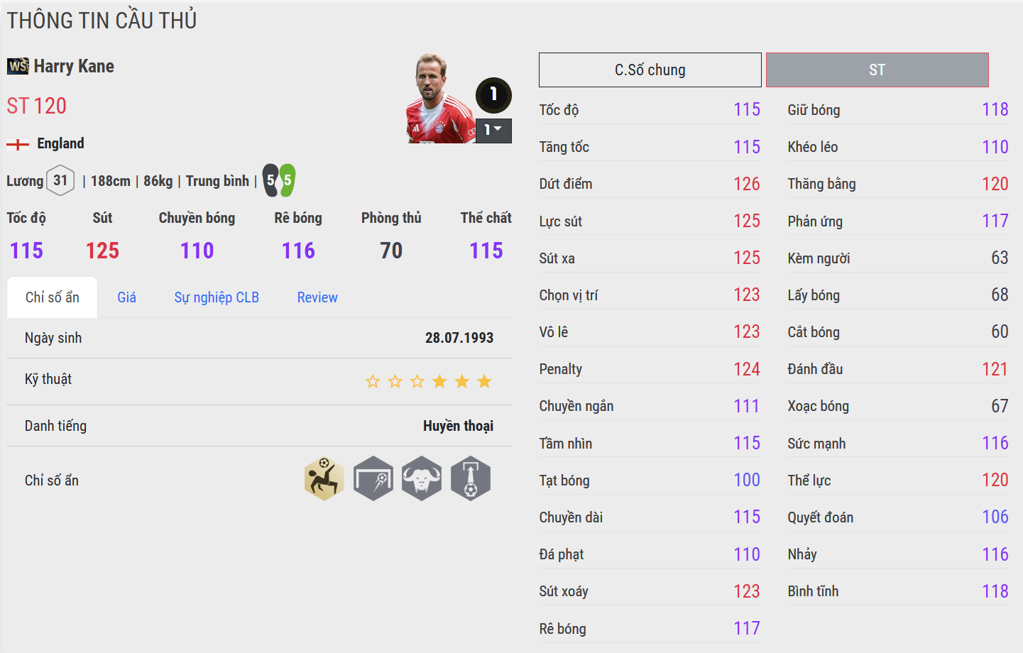 Phiên bản 26TY là lựa chọn nổi bật nhất nhờ sự hoàn thiện toàn diện trong lối chơi. Kane sở hữu khả năng dứt điểm cực kỳ ổn định, xử lý bóng gọn gàng và di chuyển thông minh để khai thác khoảng trống. Không chỉ là một tiền đạo cắm đơn thuần, Kane 26TY còn đóng vai trò trung tâm trong các pha tấn công, mang lại hiệu quả cao và sự ổn định xuyên suốt trận đấu.