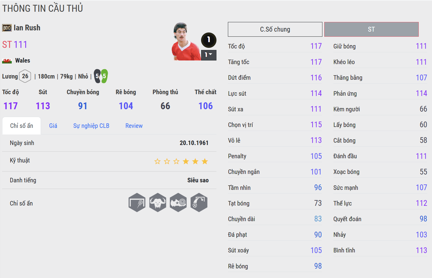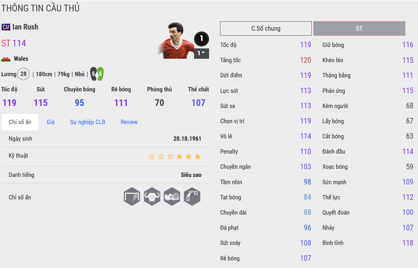 Rush CU là phiên bản hoàn thiện nhất của Ian Rush trong FC Online – nơi mọi phẩm chất sát thủ được nâng lên tầm cao nhất. Di chuyển thông minh, chọn vị trí sắc bén và dứt điểm lạnh lùng biến anh thành mũi nhọn cực kỳ đáng tin cậy trong mọi thế trận. Đây là mẫu tiền đạo không cần quá nhiều đất diễn, nhưng luôn biết cách xuất hiện đúng thời điểm để kết liễu trận đấu – xứng đáng đứng ở vị trí số một trong mọi bài top về Ian Rush.