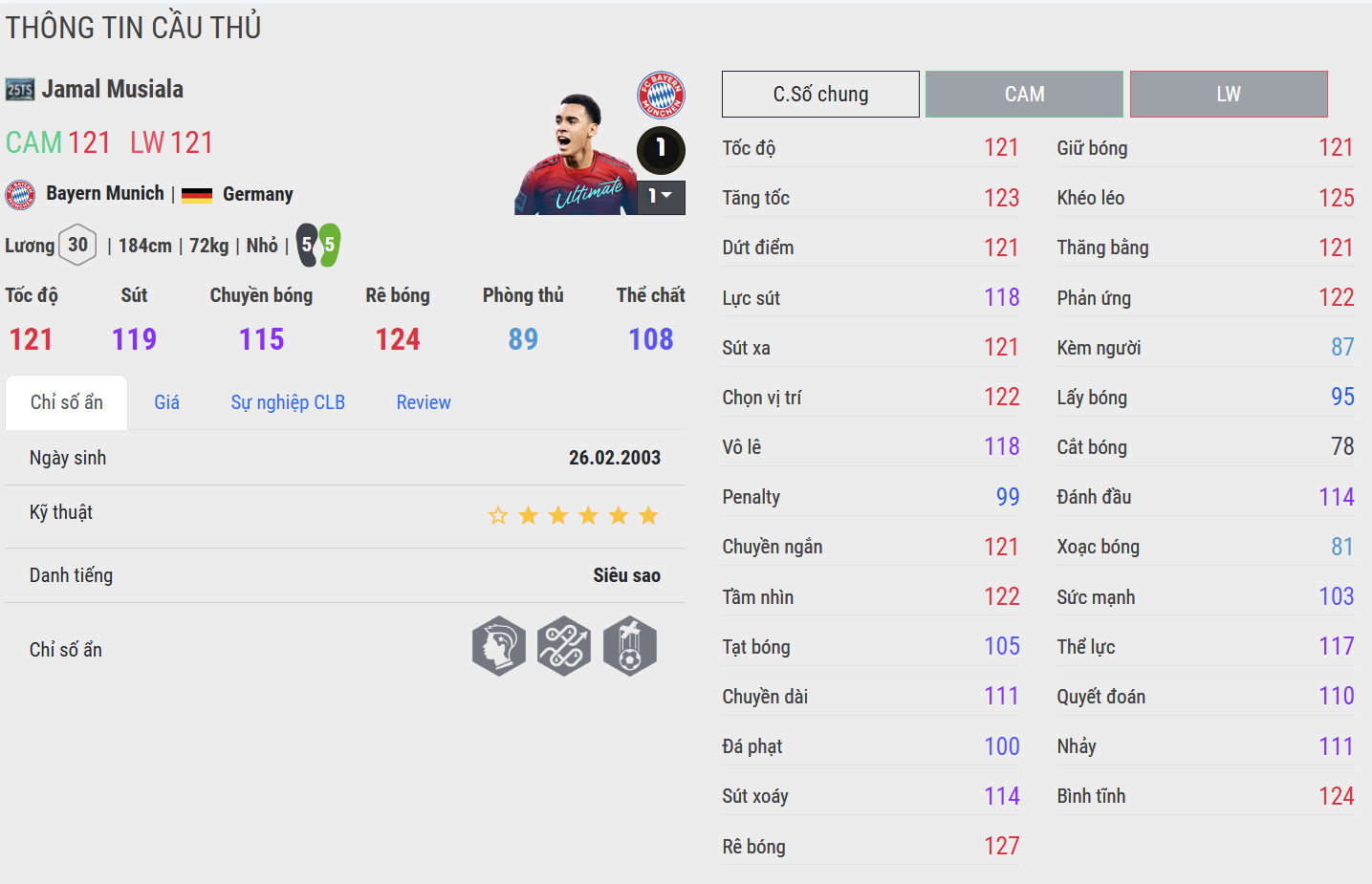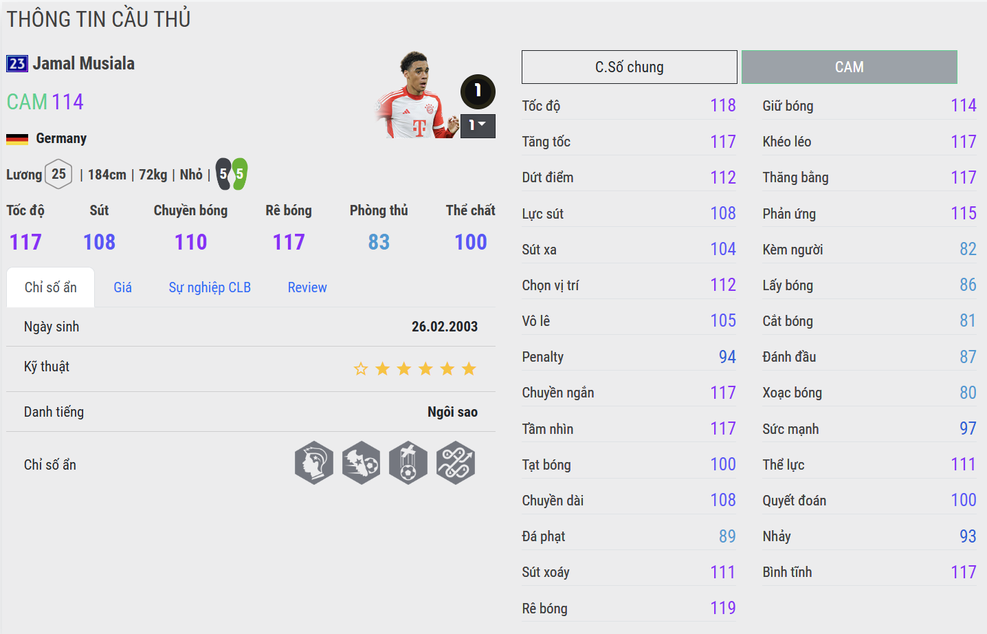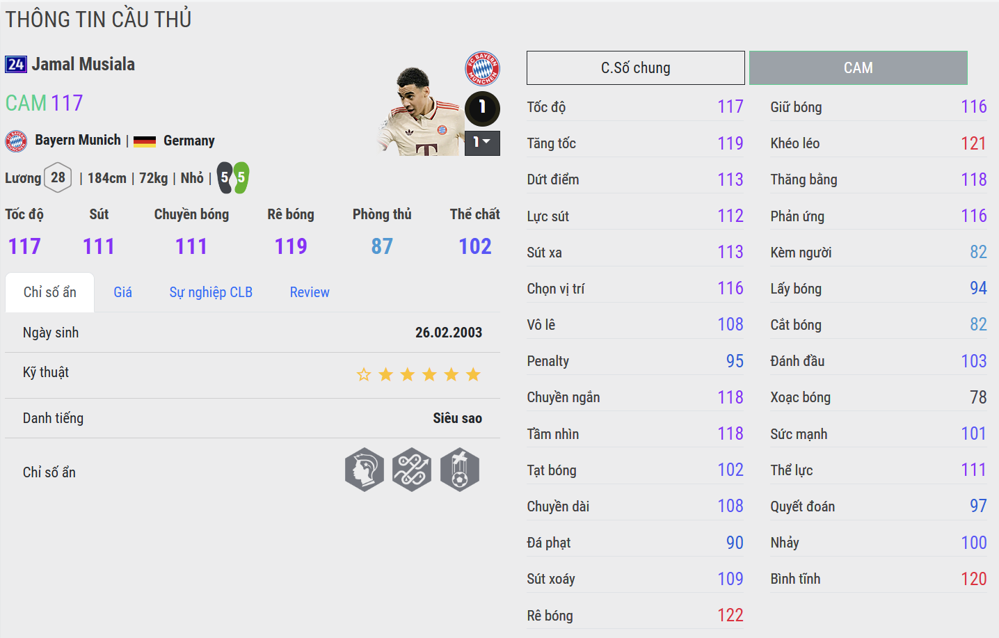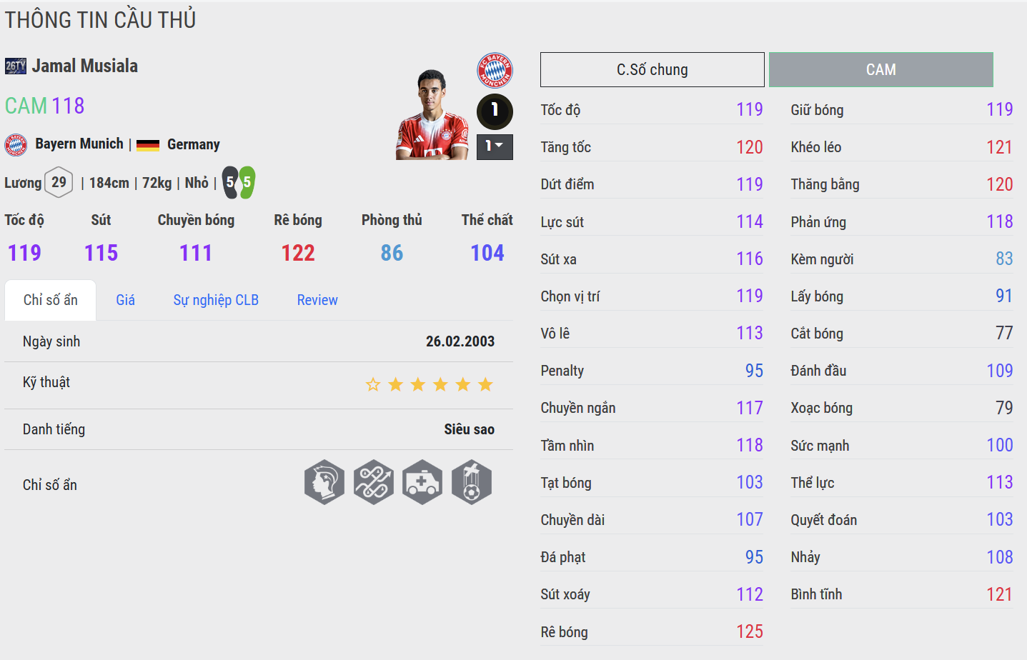 Phiên bản 26TY là đỉnh cao của Musiala trong FC Online. Tốc độ, kỹ thuật, dứt điểm và khả năng giữ bóng đều được nâng lên một tầm cao mới. Trong thực chiến, Musiala 26TY có thể tự mình tạo ra khác biệt bằng những pha rê bóng đột phá hoặc dứt điểm tinh tế, trở thành một trong những CAM “khó chịu” nhất game.