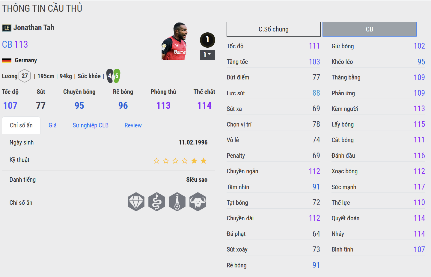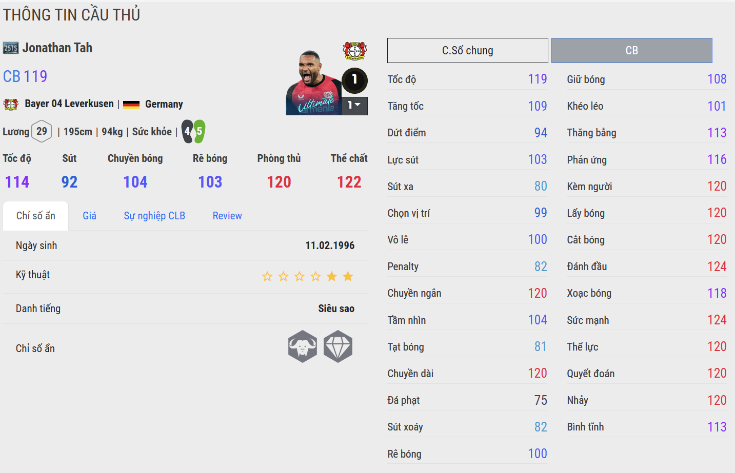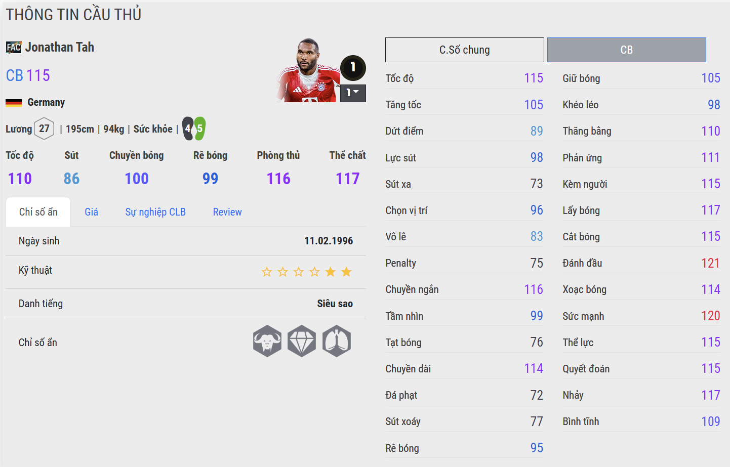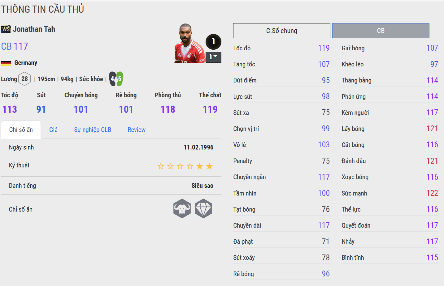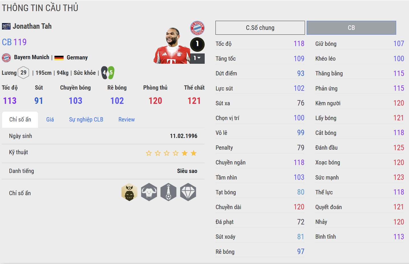 Phiên bản 26TY là đỉnh cao của Tah trong FC Online. Tốc độ, sức mạnh và khả năng phòng ngự đều được nâng cấp toàn diện. Anh vừa có thể tranh chấp áp đảo, vừa theo kèm tốt các tiền đạo nhanh. Trong meta hiện tại, Tah 26TY mang lại cảm giác cực kỳ chắc chắn và đáng tin cậy nơi hàng thủ.