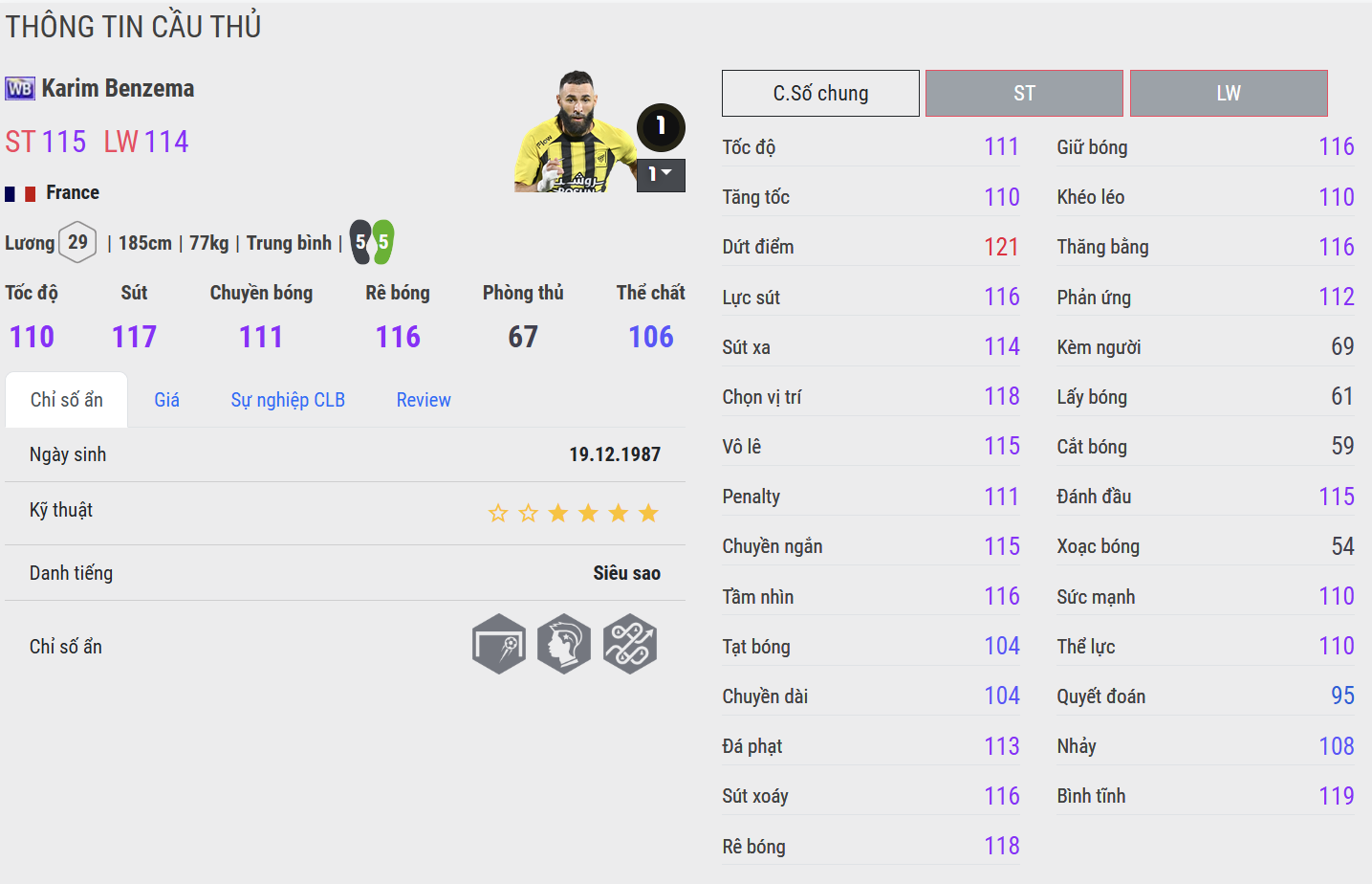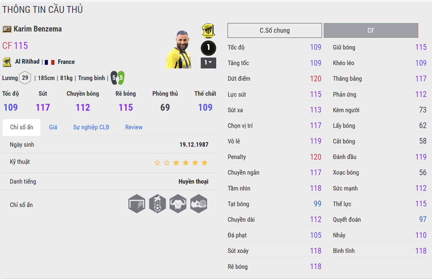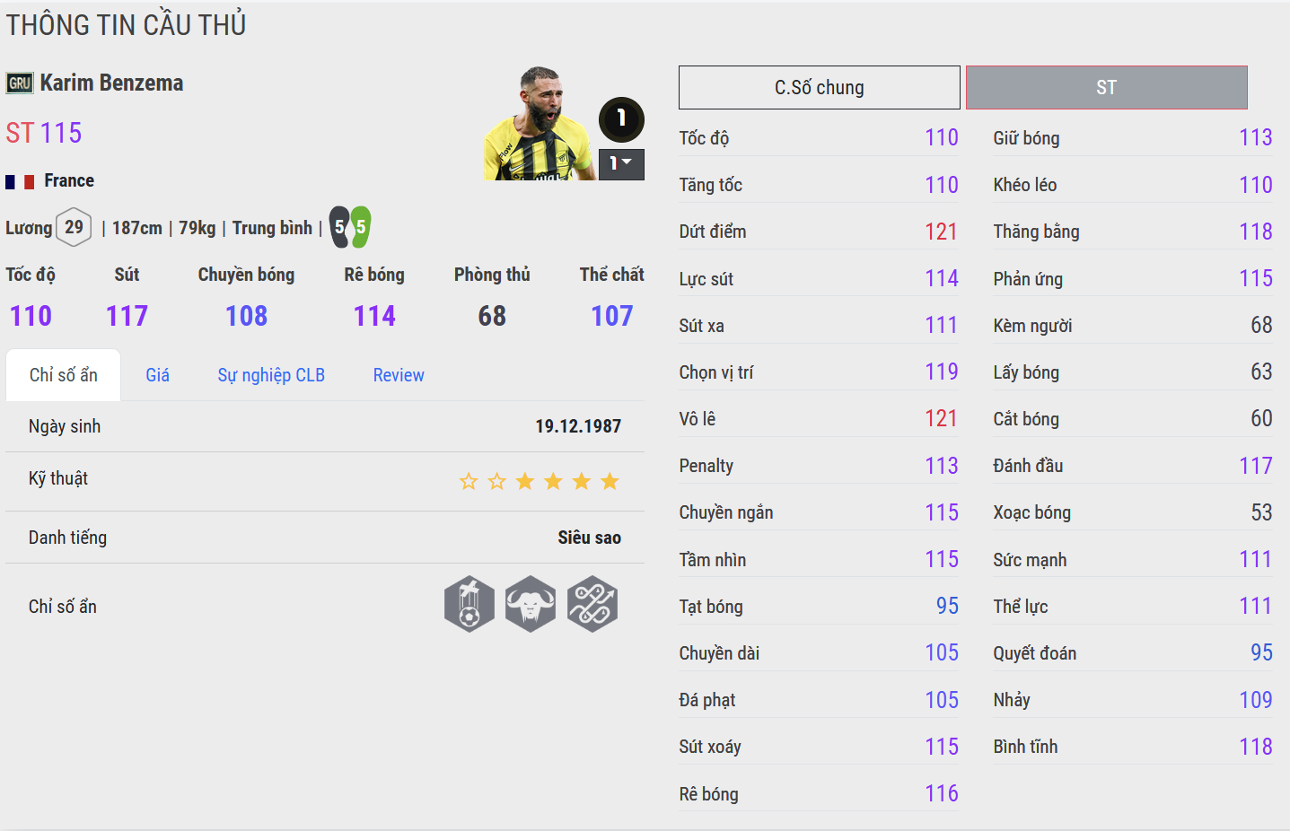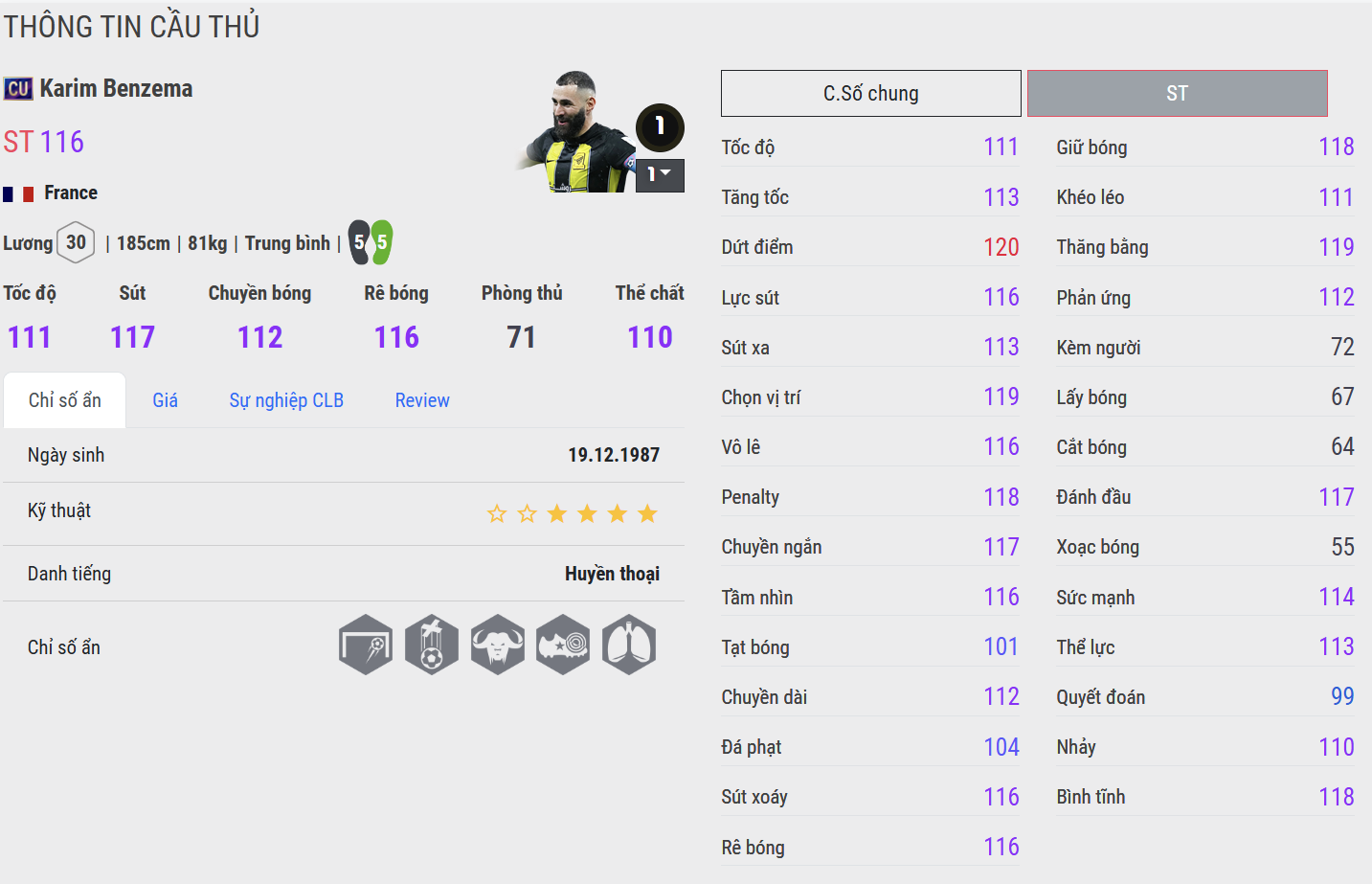 Benzema CU cho cảm giác hoàn thiện hơn ở khâu dứt điểm và giữ nhịp tấn công. Những pha chạm bóng gọn gàng, xử lý trong không gian hẹp và chọn vị trí khôn ngoan giúp anh trở thành điểm tựa đáng tin cậy ở tuyến trên. Đây là phiên bản phù hợp với lối chơi kiểm soát, nơi tiền đạo không chỉ ghi bàn mà còn đóng vai trò kết nối.
