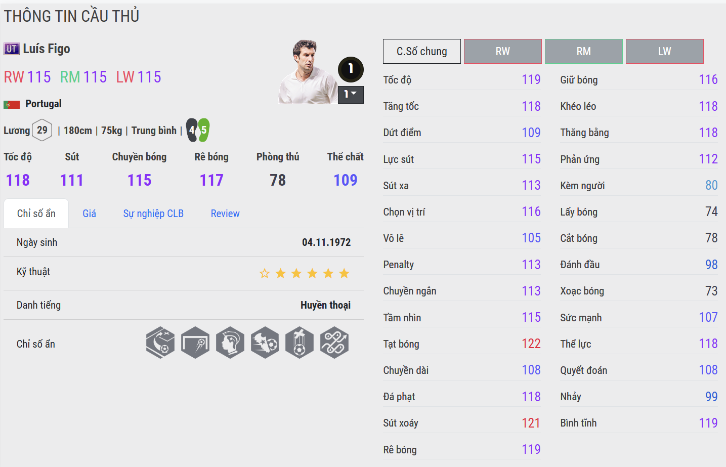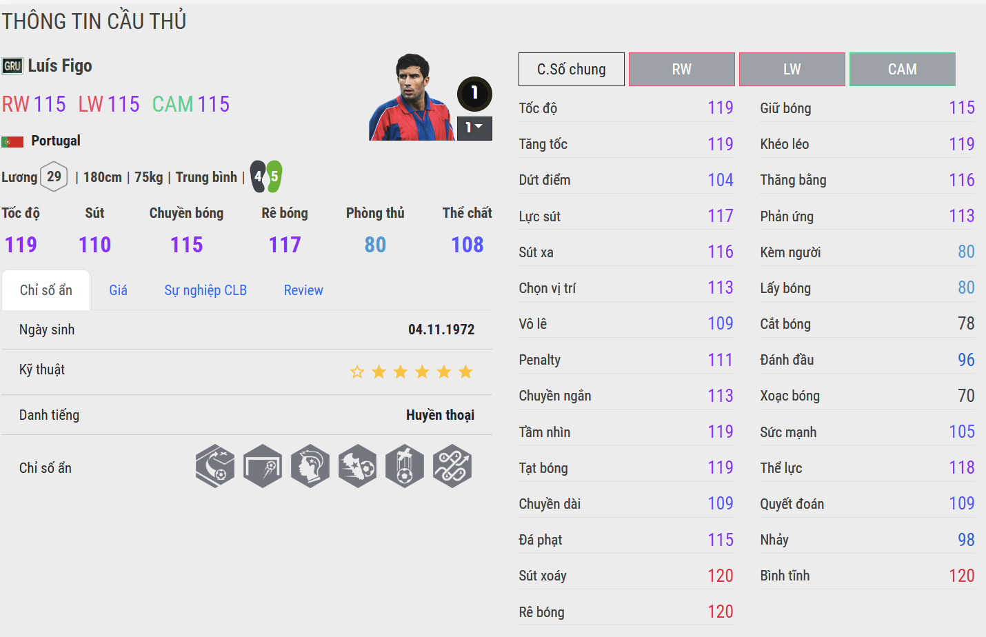 Figo BDO là phiên bản đáng dùng nhất, hội tụ trọn vẹn tinh hoa của huyền thoại người Bồ Đào Nha. Mọi phẩm chất đều rất ổn cho meta hiện tại : kỹ thuật, tư duy chơi bóng sắc bén, khả năng sáng tạo và hiệu quả trong những khoảnh khắc quyết định. Đây là hình ảnh Figo ở đẳng cấp cao – một tiền vệ cánh mang tầm biểu tượng, đủ sức định hình nhịp điệu và cảm xúc cho toàn bộ hệ thống tấn công.