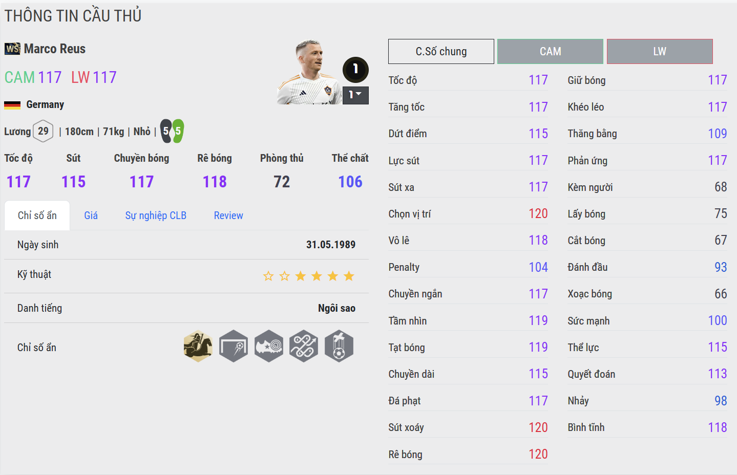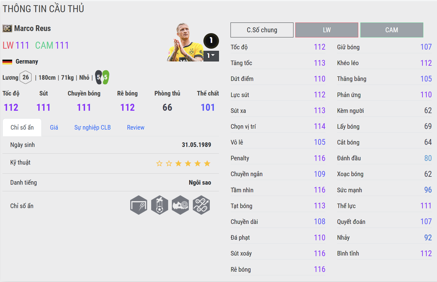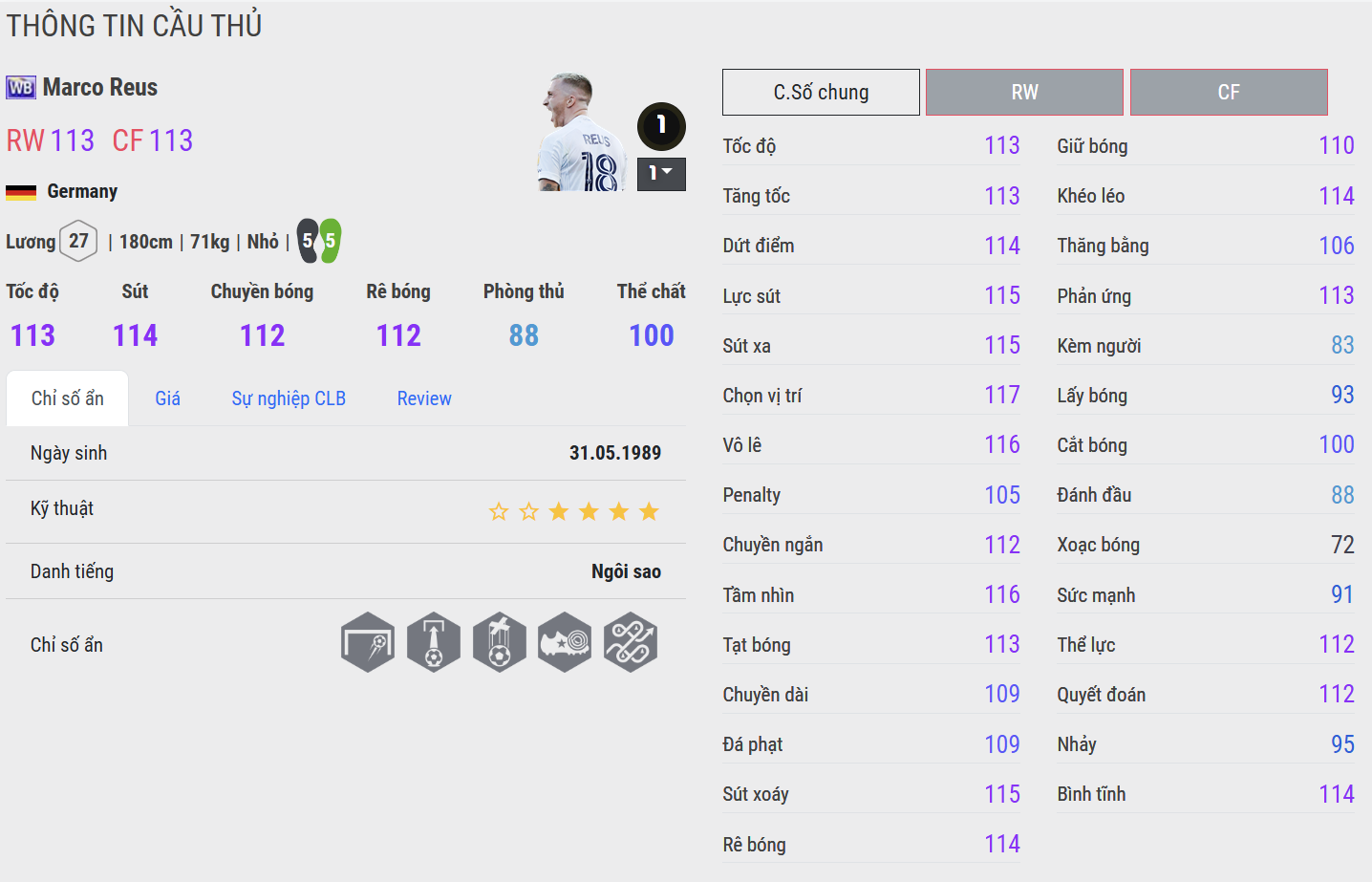 Hoàn thiện – mượt, tinh tế và cực kỳ hiệu quả. Phiên bản WS là đỉnh cao của Reus trong FC Online. Anh sở hữu sự cân bằng hoàn hảo giữa tốc độ, kỹ thuật và dứt điểm. Trong thực chiến, Reus WS mang lại cảm giác xử lý rất “bay”, di chuyển thông minh và luôn biết cách tạo ra khác biệt ở những thời điểm quan trọng.