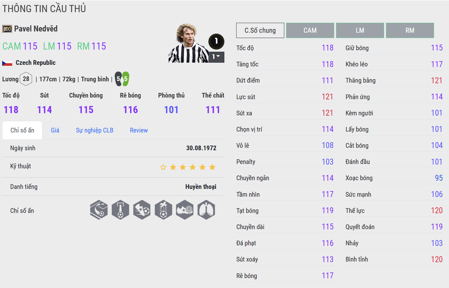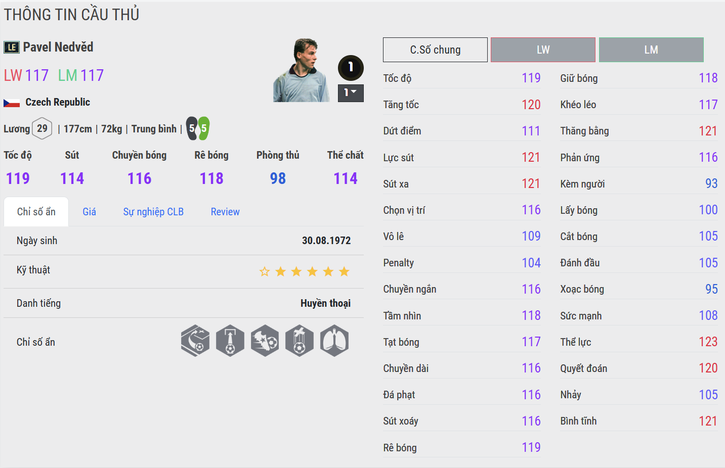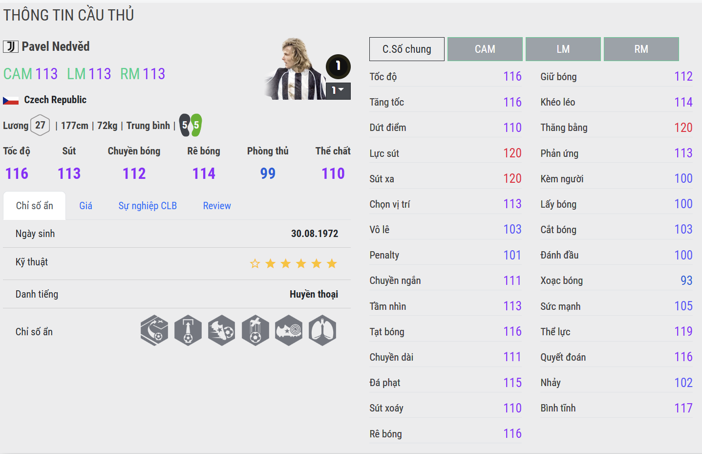 LE là mùa thẻ tái hiện hình ảnh Pavel Nedved ở đỉnh cao phong độ. Tốc độ, nền tảng thể lực dồi dào cùng những pha băng lên dứt điểm đầy quyết đoán khiến anh trở thành mũi khoan lợi hại bên hành lang cánh hoặc trung lộ. Nedved LE mang lại cảm giác “đã tay” trong thực chiến, đặc biệt ở những tình huống sút xa và xâm nhập vòng cấm.