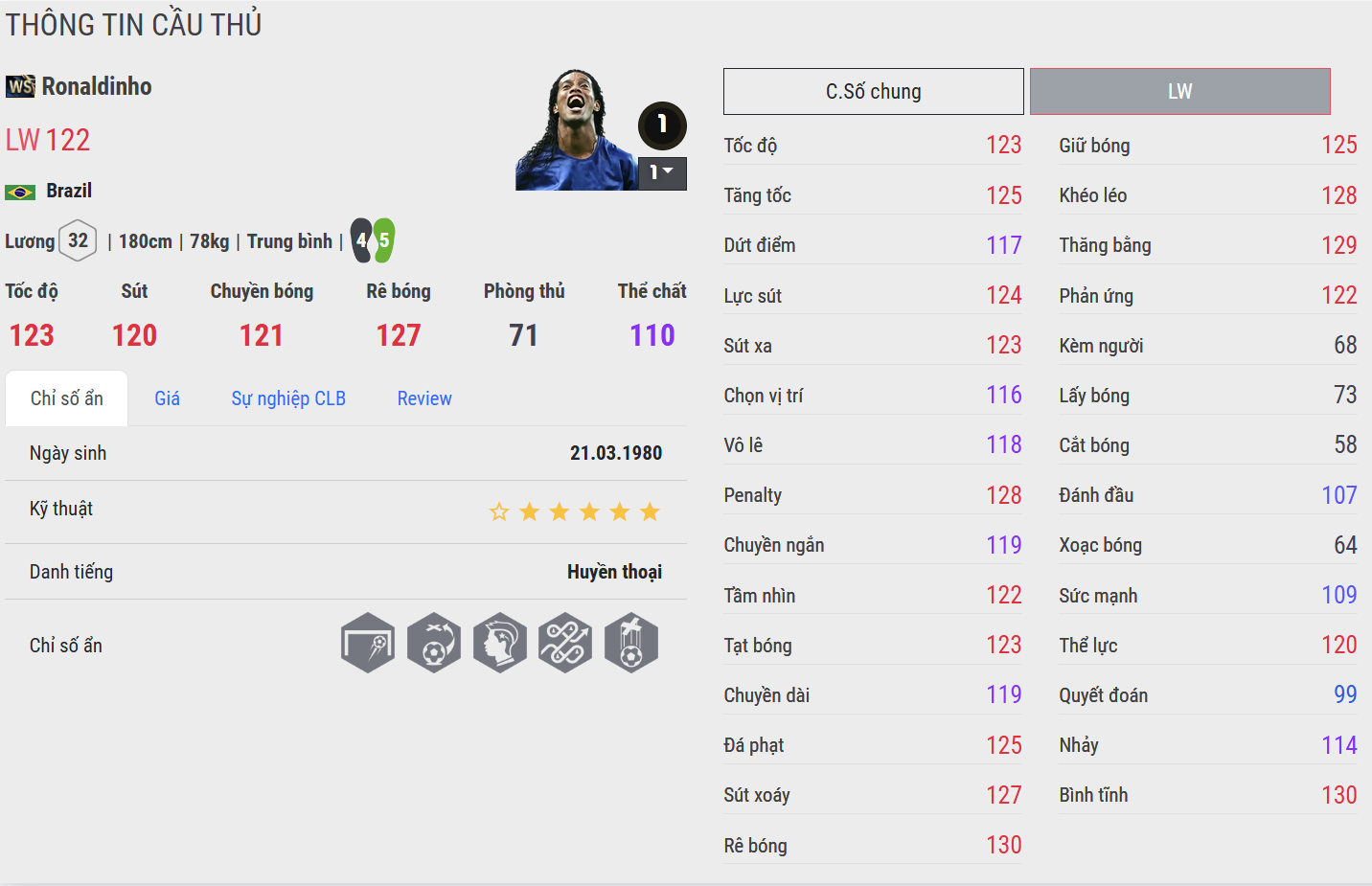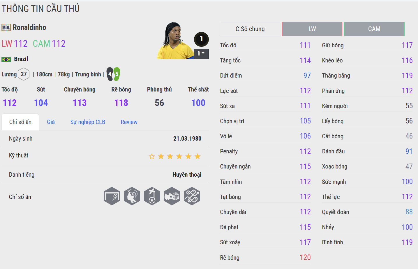 Ronaldinho CU là phiên bản toàn diện và hiệu quả nhất trong game hiện tại. Bộ chỉ số kỹ thuật gần như hoàn hảo giúp anh kiểm soát bóng cực kỳ mượt, thực hiện các pha rê dắt đầy ngẫu hứng và tạo ra đột biến liên tục. Không chỉ giỏi kiến tạo, Ronaldinho CU còn sở hữu khả năng dứt điểm rất tốt cả trong lẫn ngoài vòng cấm. Sự kết hợp giữa kỹ thuật, sáng tạo và hiệu quả giúp phiên bản này trở thành lựa chọn hàng đầu cho vị trí hộ công trong nhiều đội hình mạnh.