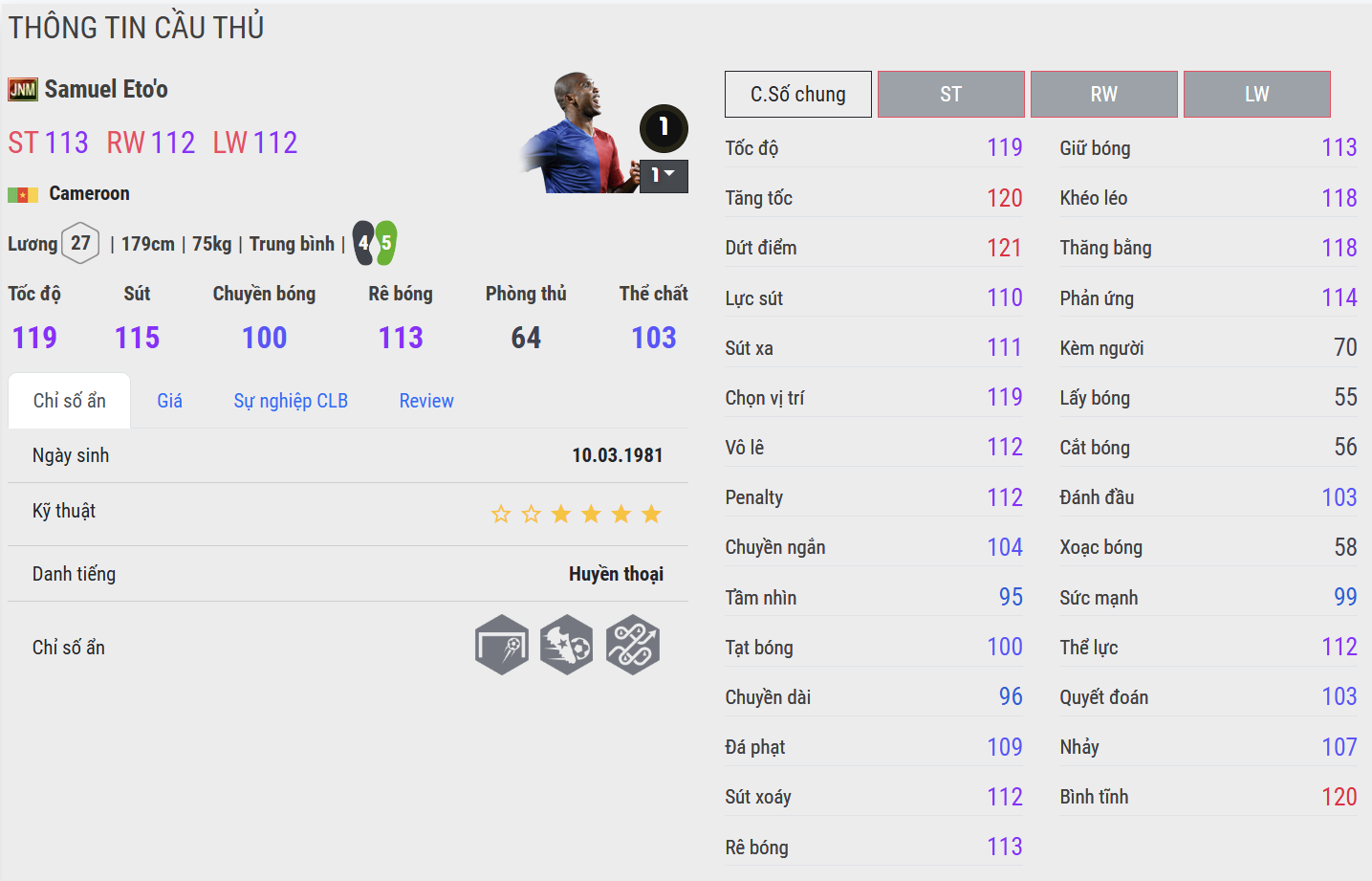 Eto’o WS là mùa thẻ đáng dùng của “Báo đen”. Tốc độ bùng nổ, dứt điểm đạt độ ổn định rất cao và cảm giác vào bóng cực kỳ gọn gàng khiến mùa thẻ này trở thành sát thủ đúng nghĩa. Dù đá cắm hay lệch phải trong sơ đồ hai tiền đạo, Eto’o WS luôn mang lại khả năng kết liễu trận đấu chỉ trong một khoảnh khắc.
